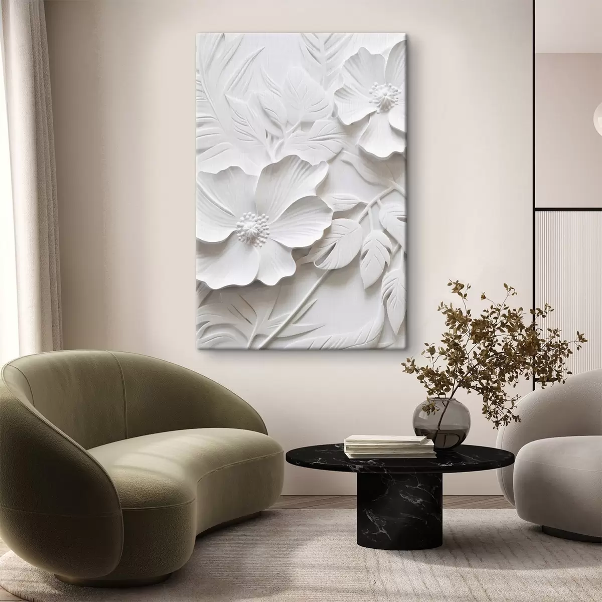 Vászonkép Dekoratív minimalista fehér virágok levelekkel, dombormű utánzat, fehér háttér Nr s45180