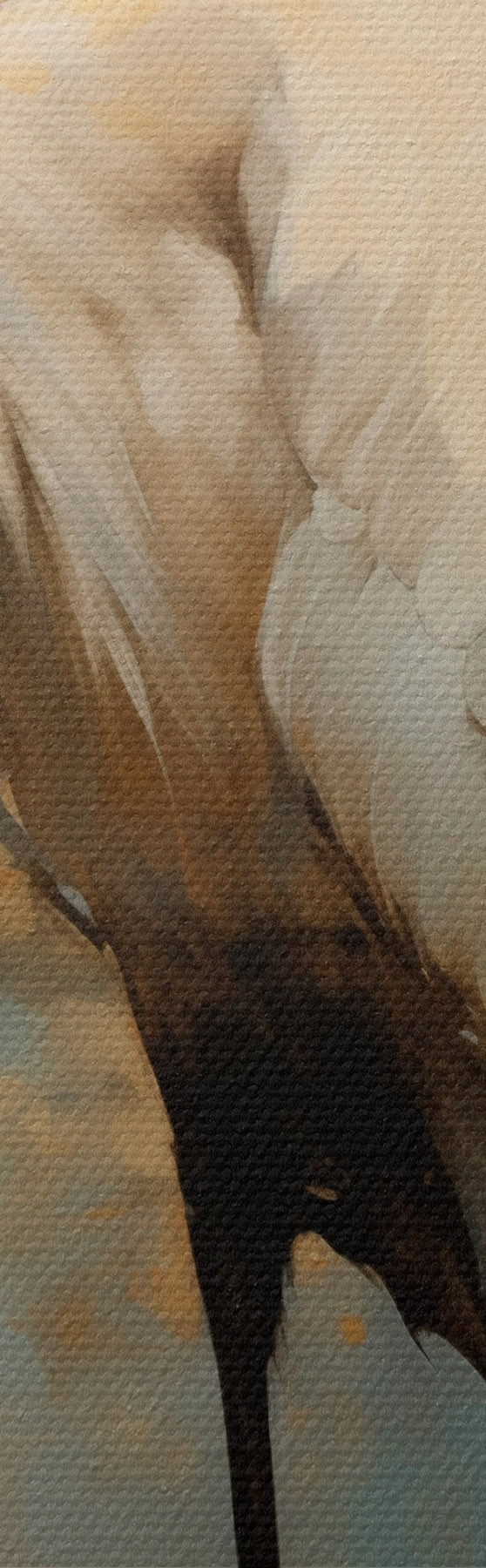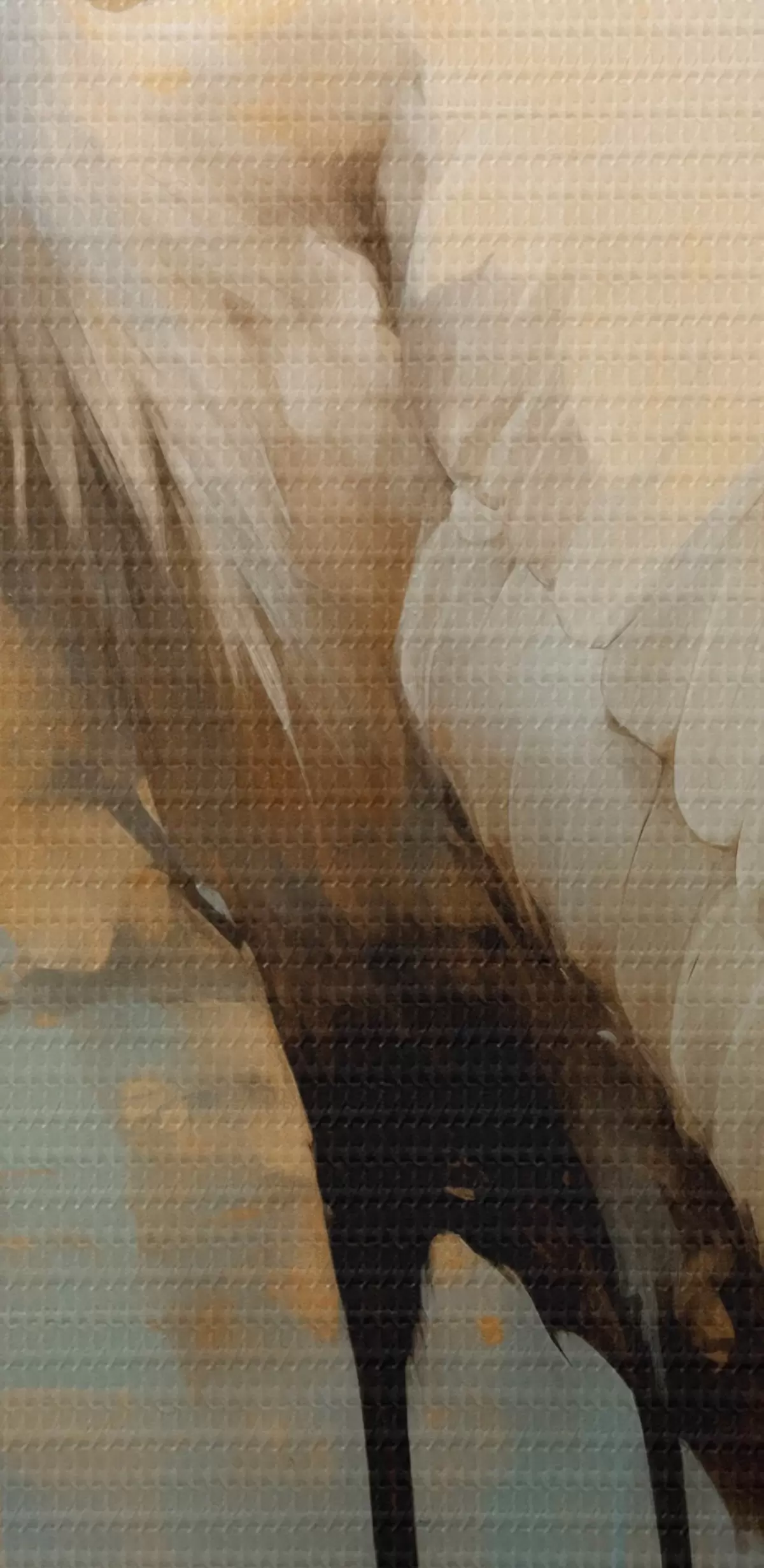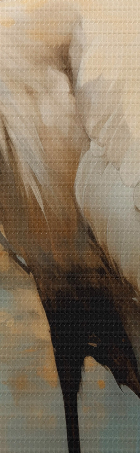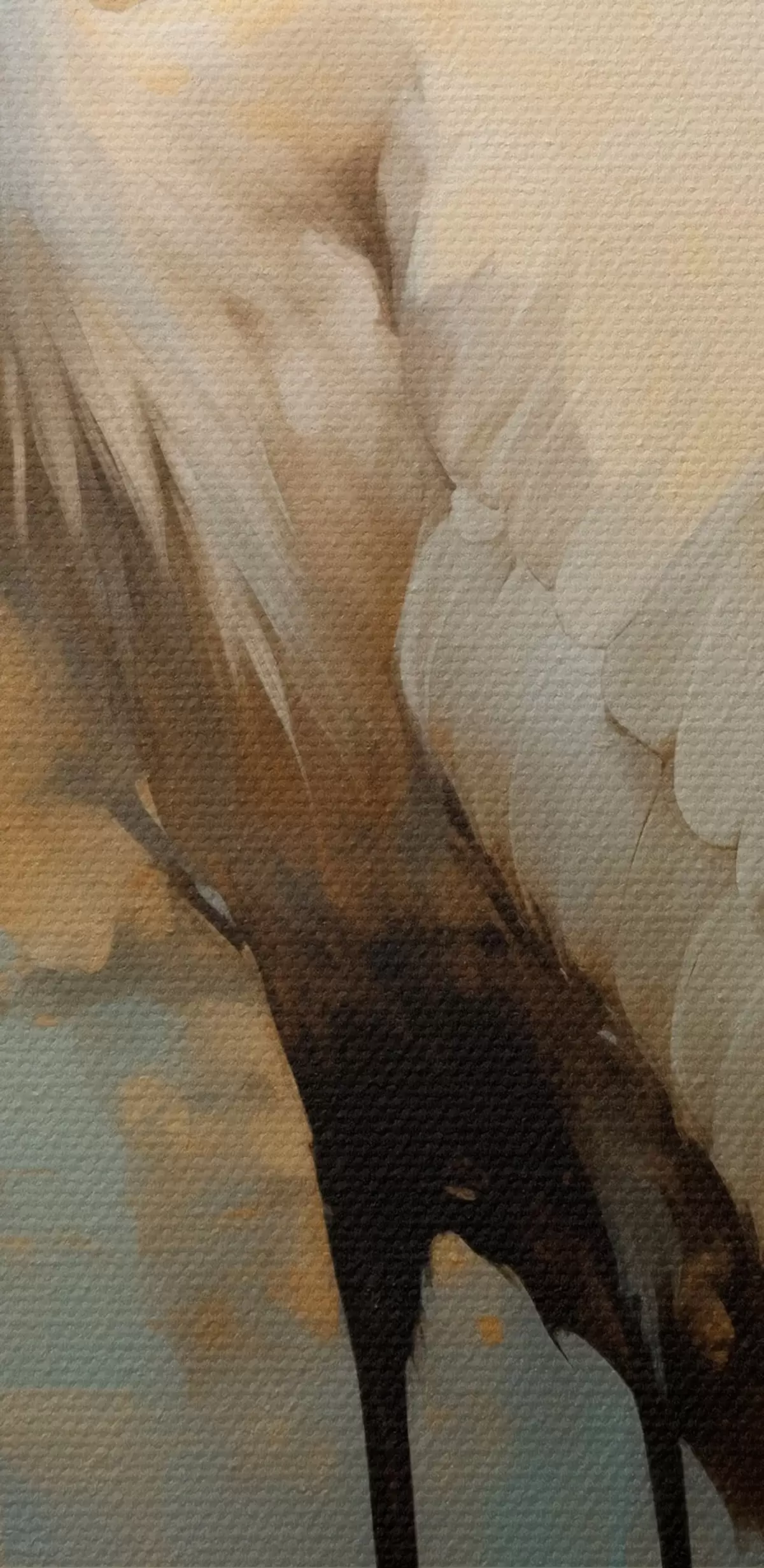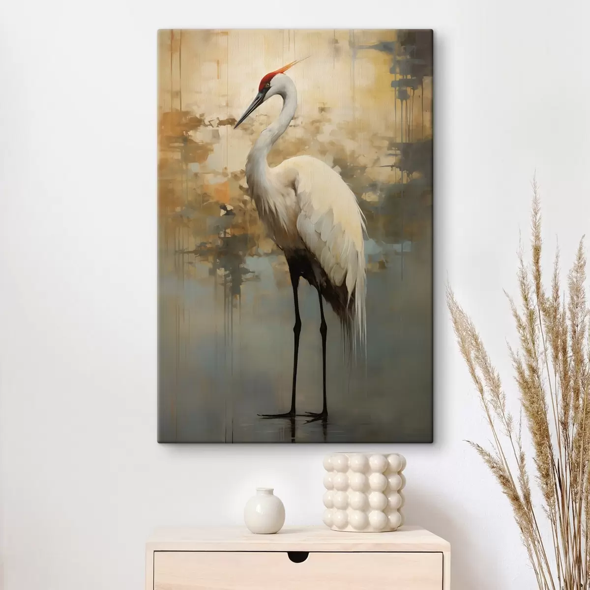 Vászonkép Fehér kócsag egy ködös, absztrakt tájat sugalló, tompa sárga, barna és kék árnyalatokból álló háttér előtt Nr s45192
