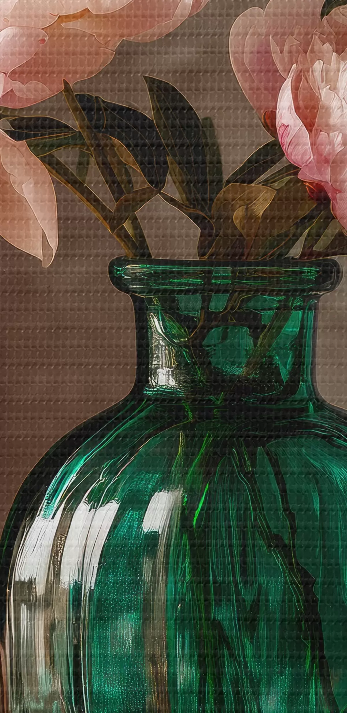 fotótapéta Finom rózsaszín bazsarózsák smaragdzöld vázában s45261