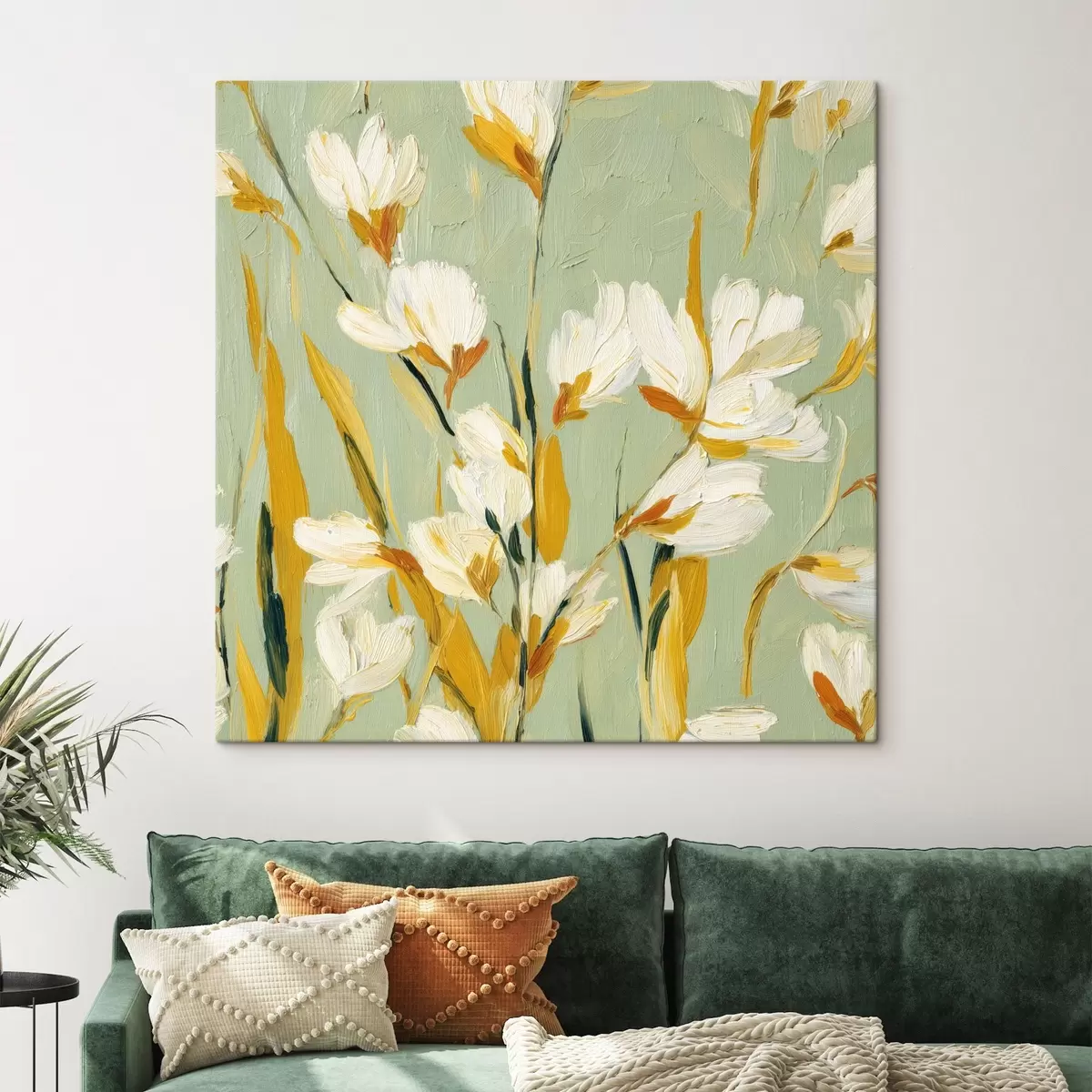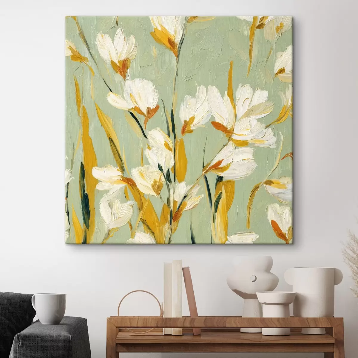 Vászonkép Fehér virágok sárga akcentussal menta háttéren ecsetvonás stílusban Nr s45264