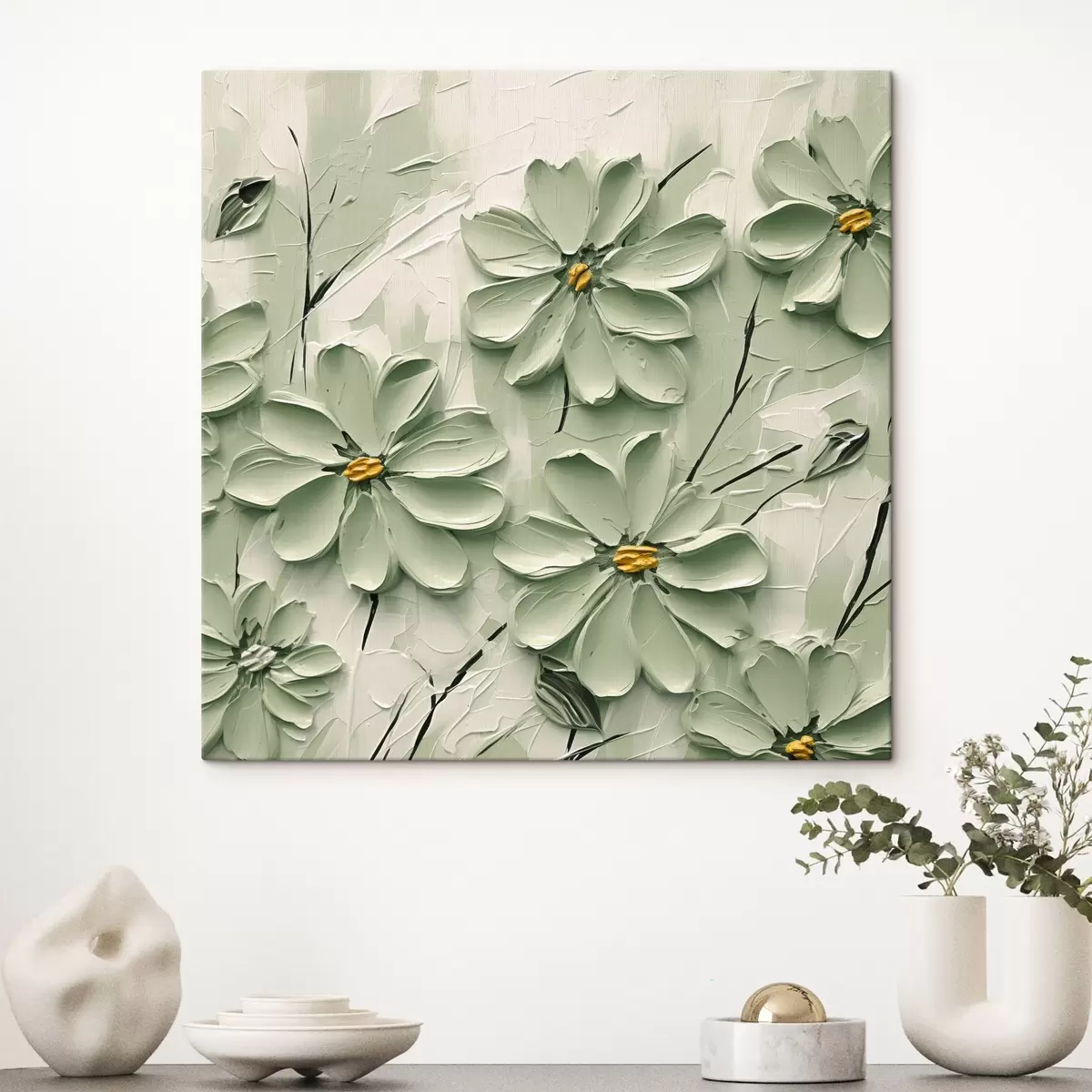 Vászonkép Zöld virágok sárga központok festett sűrű ecsetvonásokkal világos háttéren Nr s45265