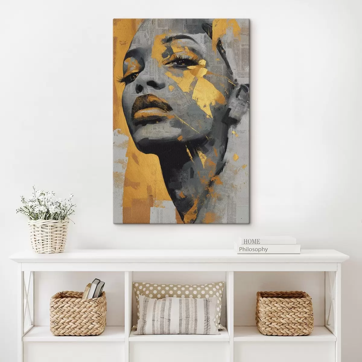 Vászonkép Vegyes média portré újságtöredékekkel és dekoratív ecsetvonásokkal Nr s45419