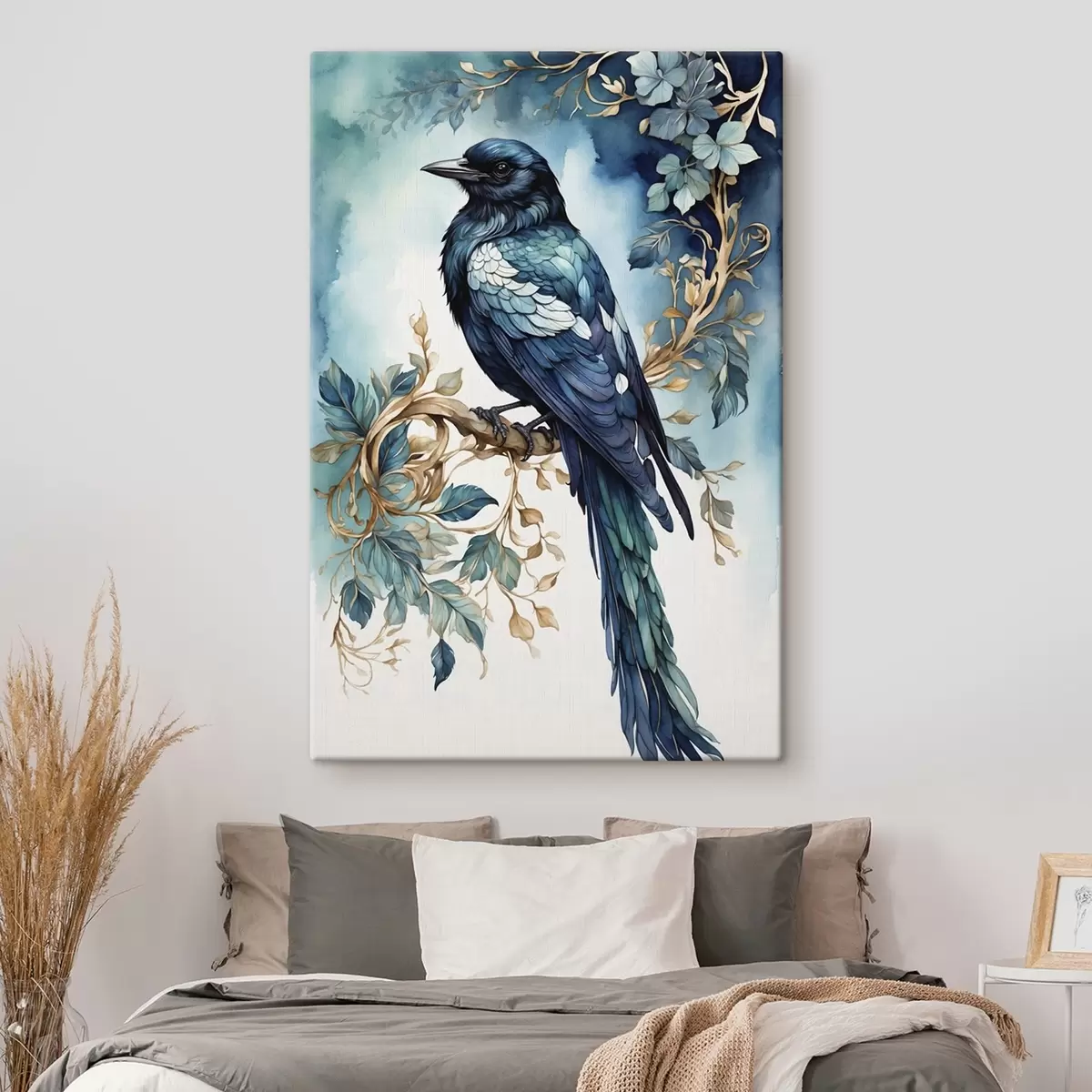 Vászonkép Kék madár egy ágon akvarell stílusú levelekkel Nr s45483