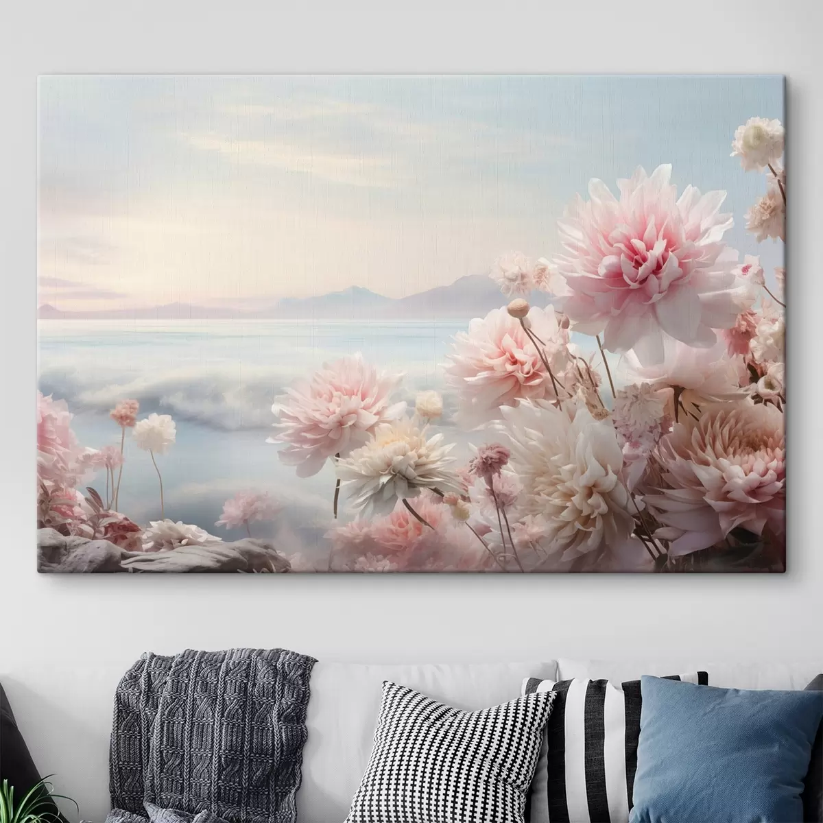 Vászonkép Finom rózsaszín virágok a tengerparton hajnalban Nr s45496