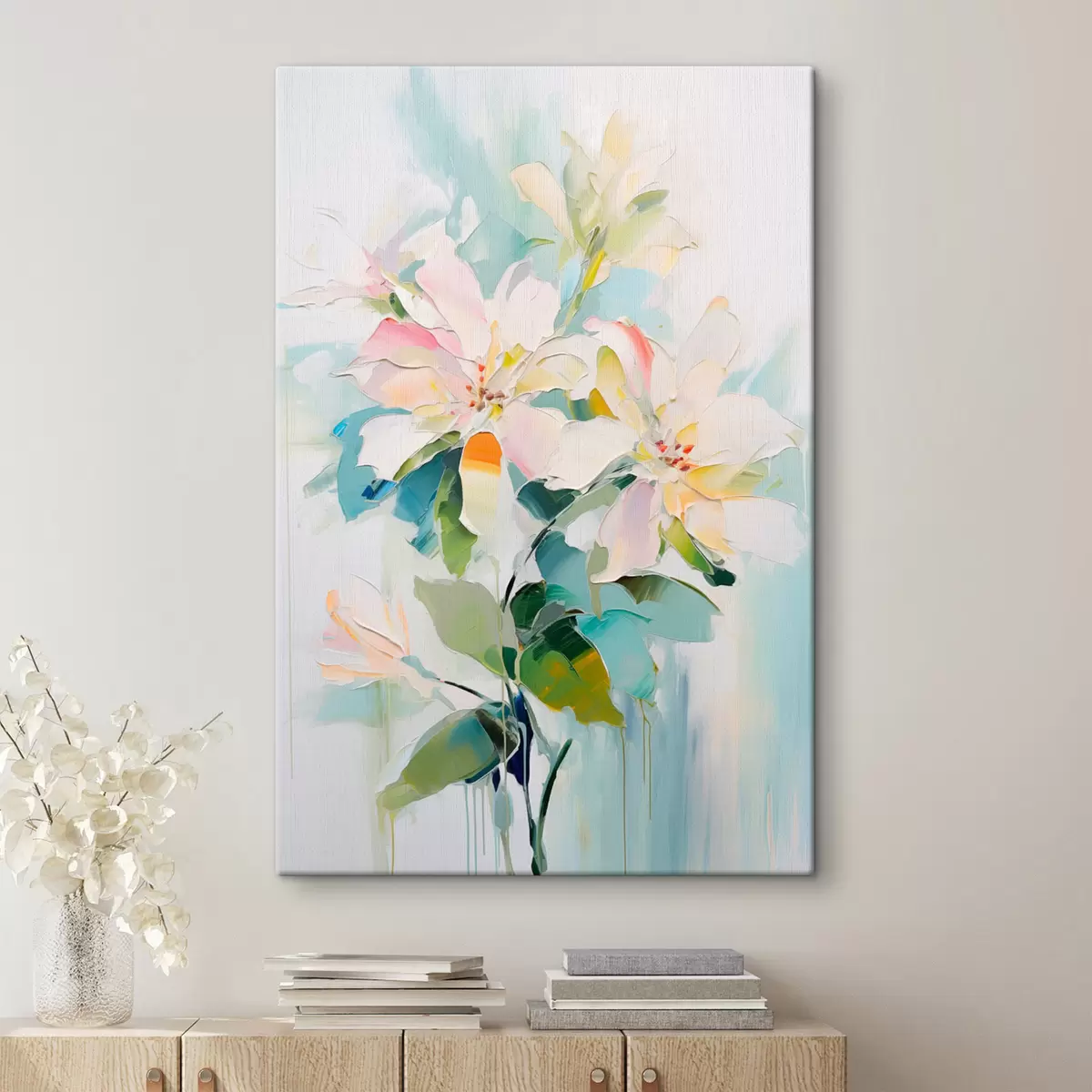 Vászonkép Virágok színes akcentussal, zöld levelek, lágy ecsetvonásokkal olajfestmény utánzat, világoskék háttérrel Nr s45549