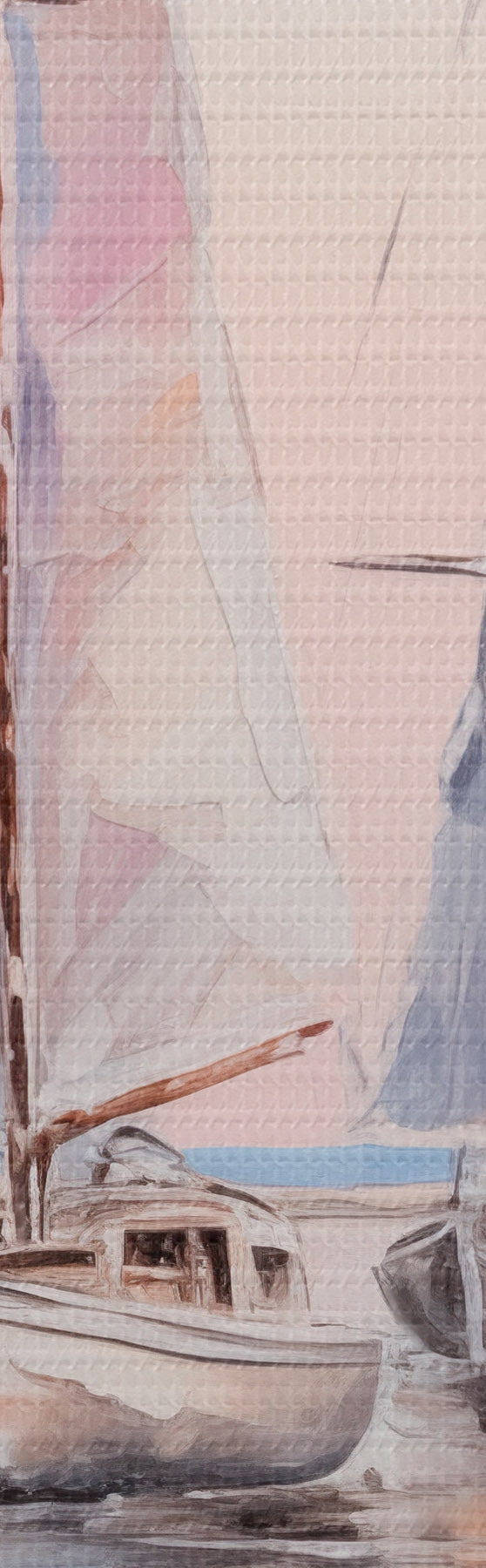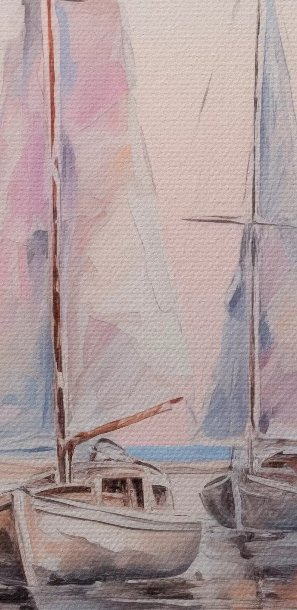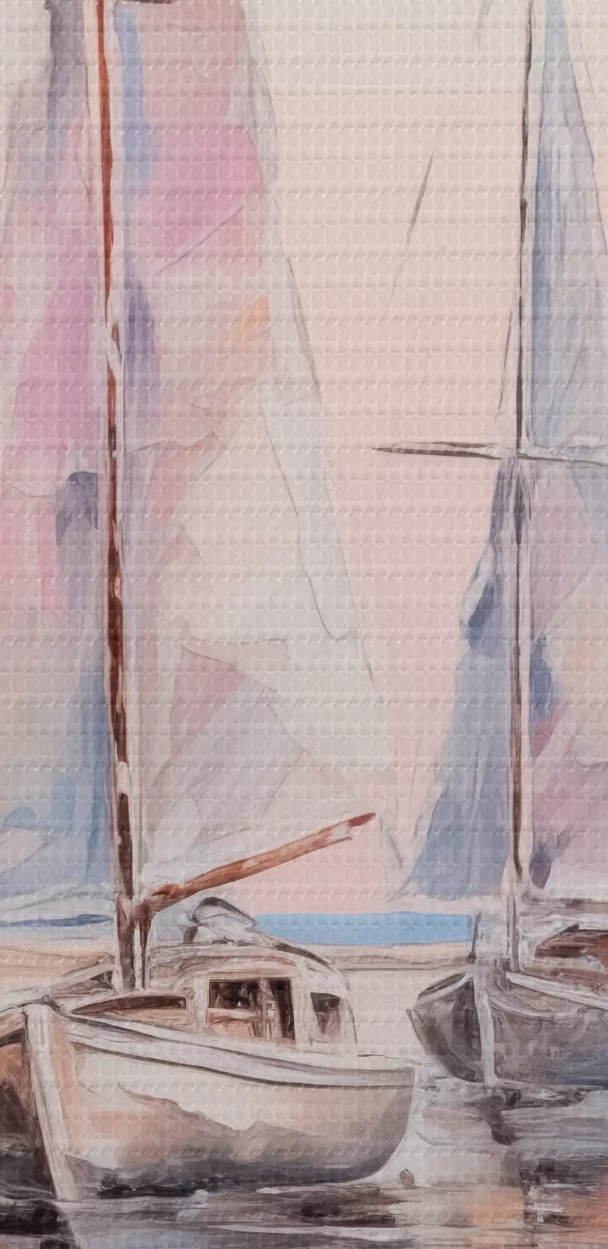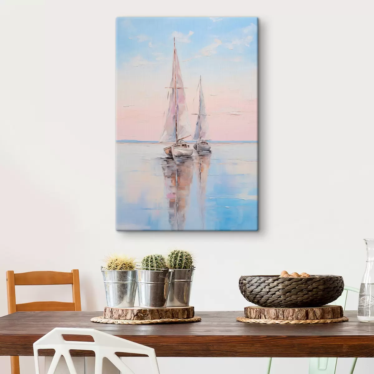Vászonkép Vitorlások rózsaszín vitorlákkal a nyugodt tengeren, a hajók tükröződése a vízben, lágy pasztellszínekben Nr s45558