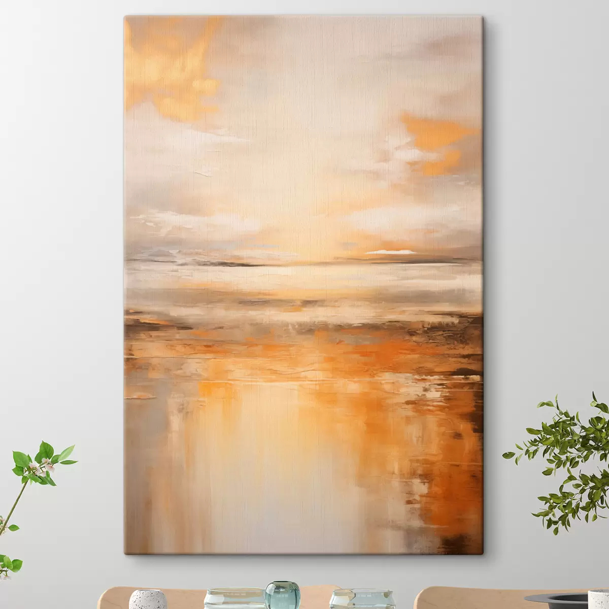 Vászonkép Absztrakt festmény egy tengerparti tájkép nyugodt óceánnal, narancssárga homokkal és felhős égbolt napfényben Nr s45567
