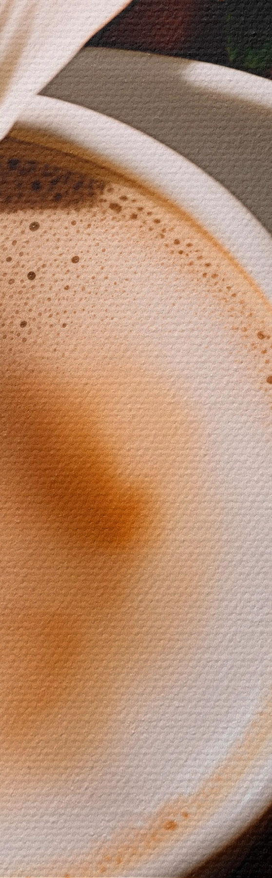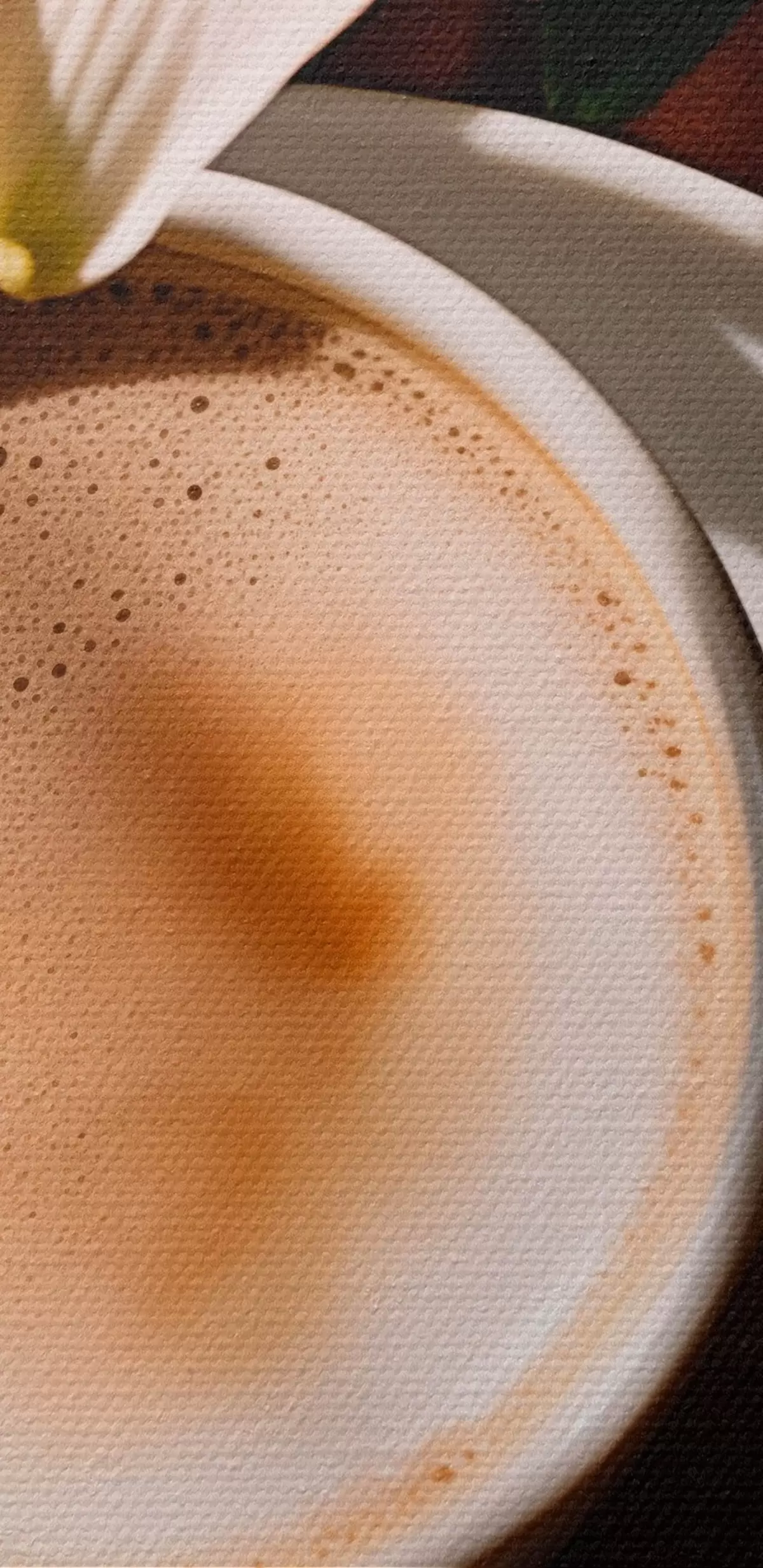 Vászonkép Egy csésze kávé habbal egy fehér tányéron, a háttérben néhány virág, napfényben Nr s45569