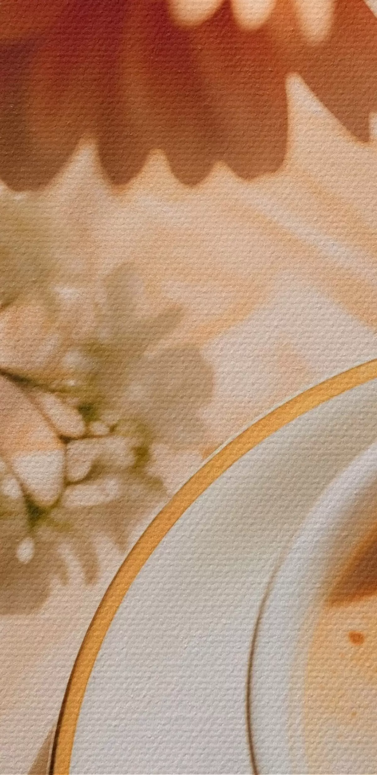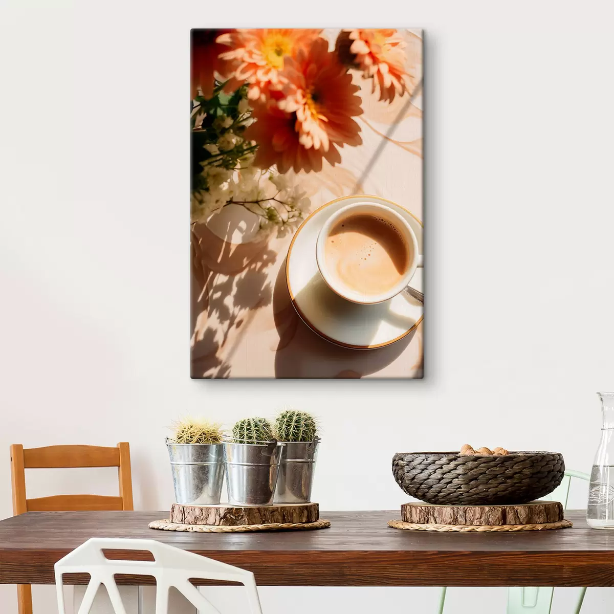 Vászonkép Egy csésze kávé habbal egy fehér tányéron, a háttérben néhány virág, napfényben Nr s45570