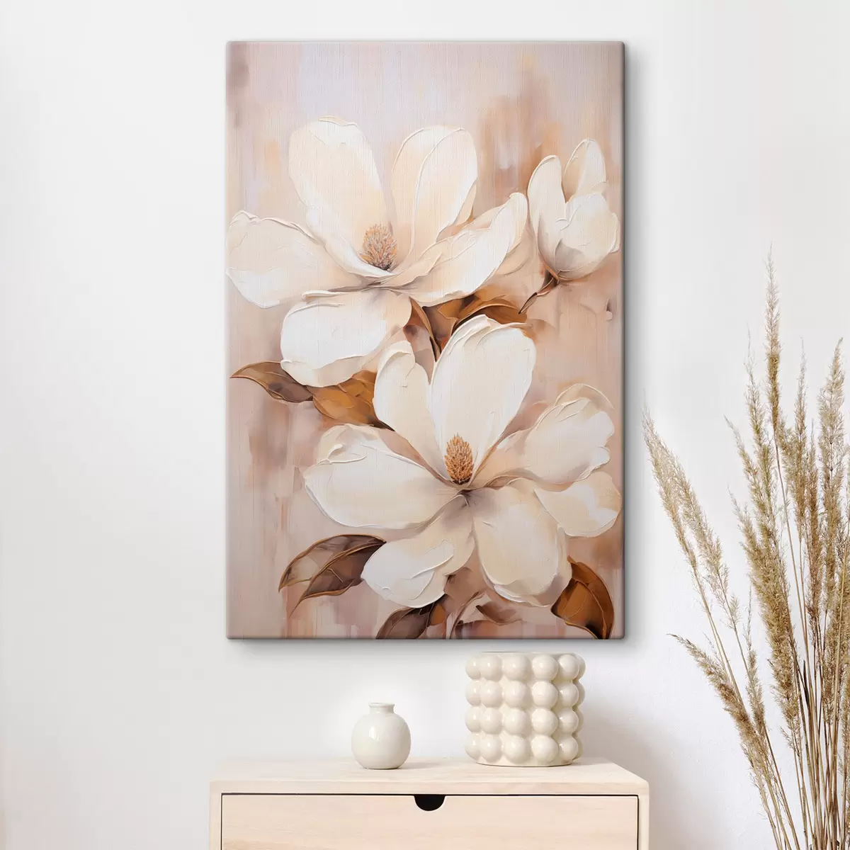 Vászonkép Fehér magnólia virágok lágy, elmosódott háttér előtt, bézs és barna tónusok, festmény stílusban Nr s45572