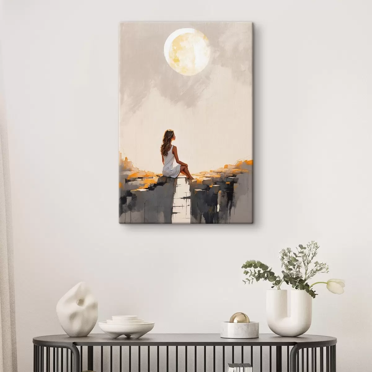 Vászonkép Lány fehér ruhában ül egy nagy hold alatt Nr s45621