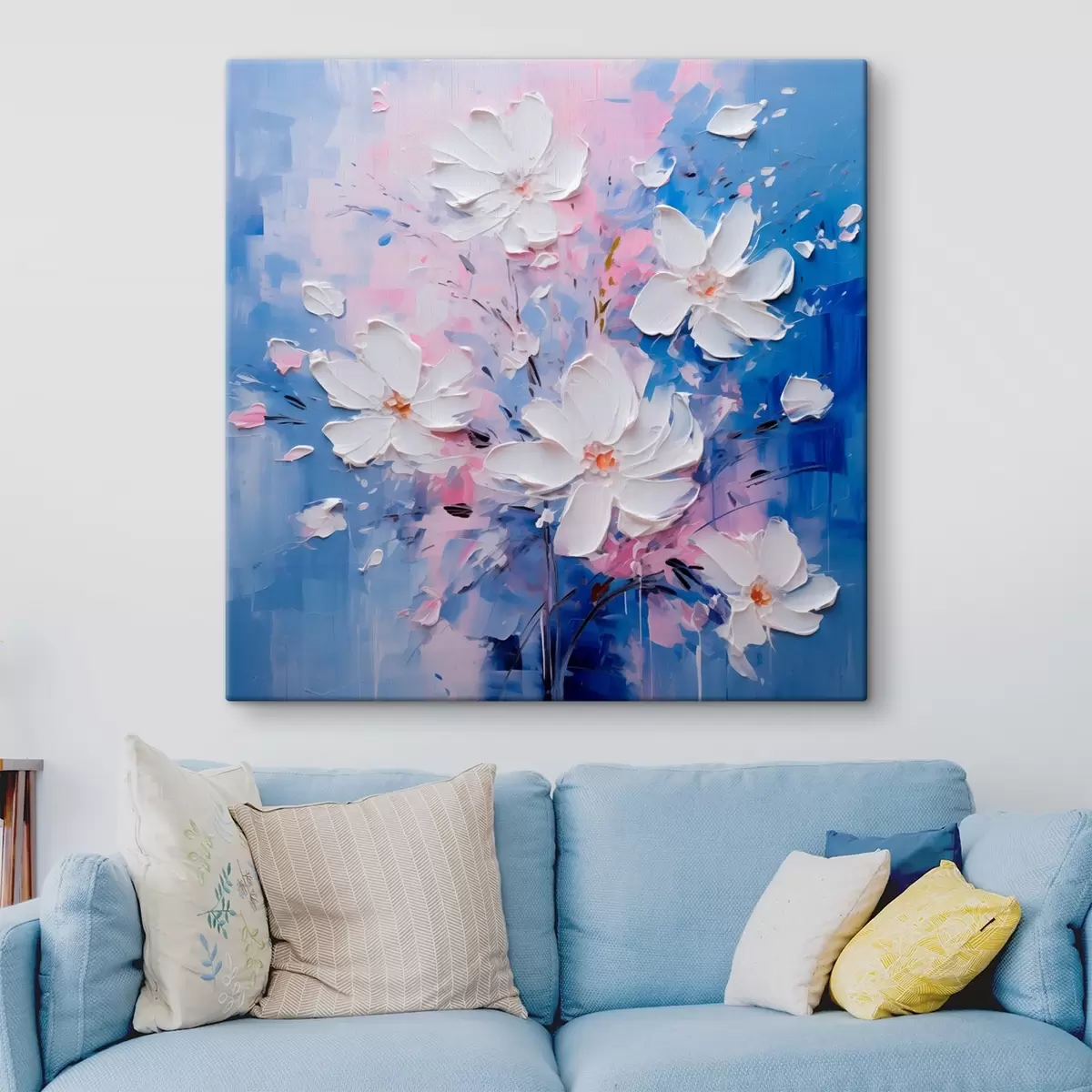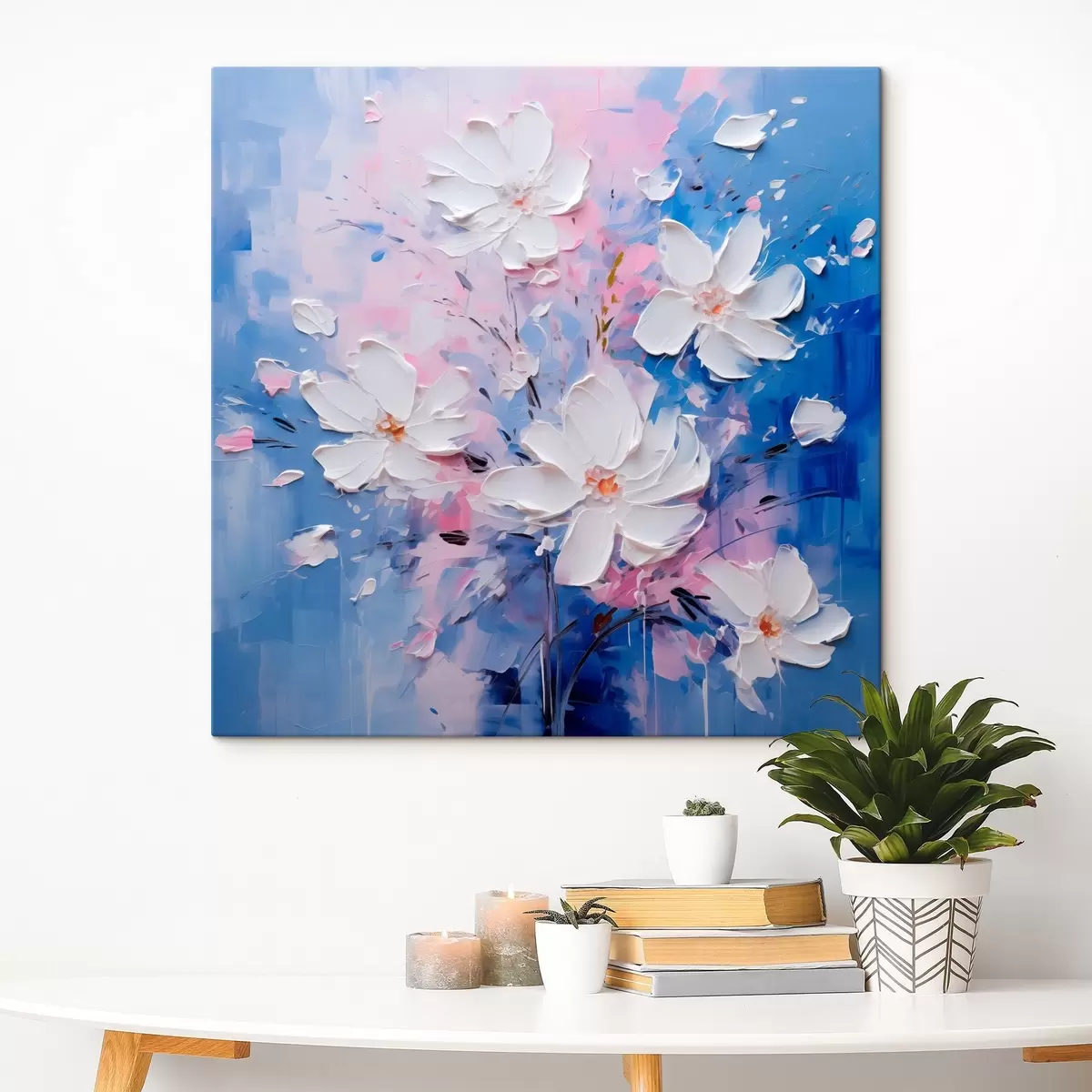 Vászonkép Volumetrikus virágok kék háttéren, impasto stílusban Nr s45648
