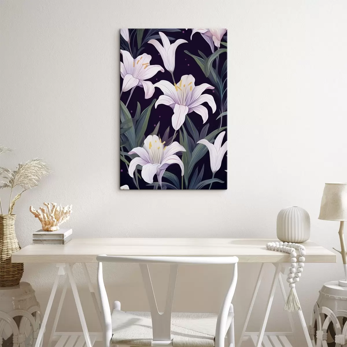 Vászonkép Finom liliomok sötét háttéren zöld levelekkel Nr s45697