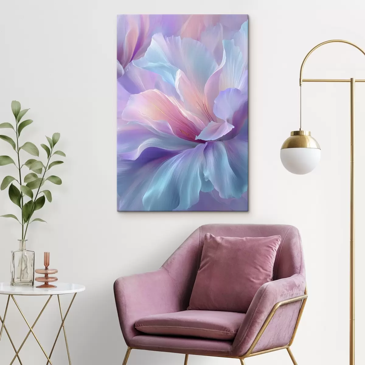 Vászonkép finom, fantáziadús virág, lila, kék és rózsaszín árnyalatú szirmokkal. Nr s45710