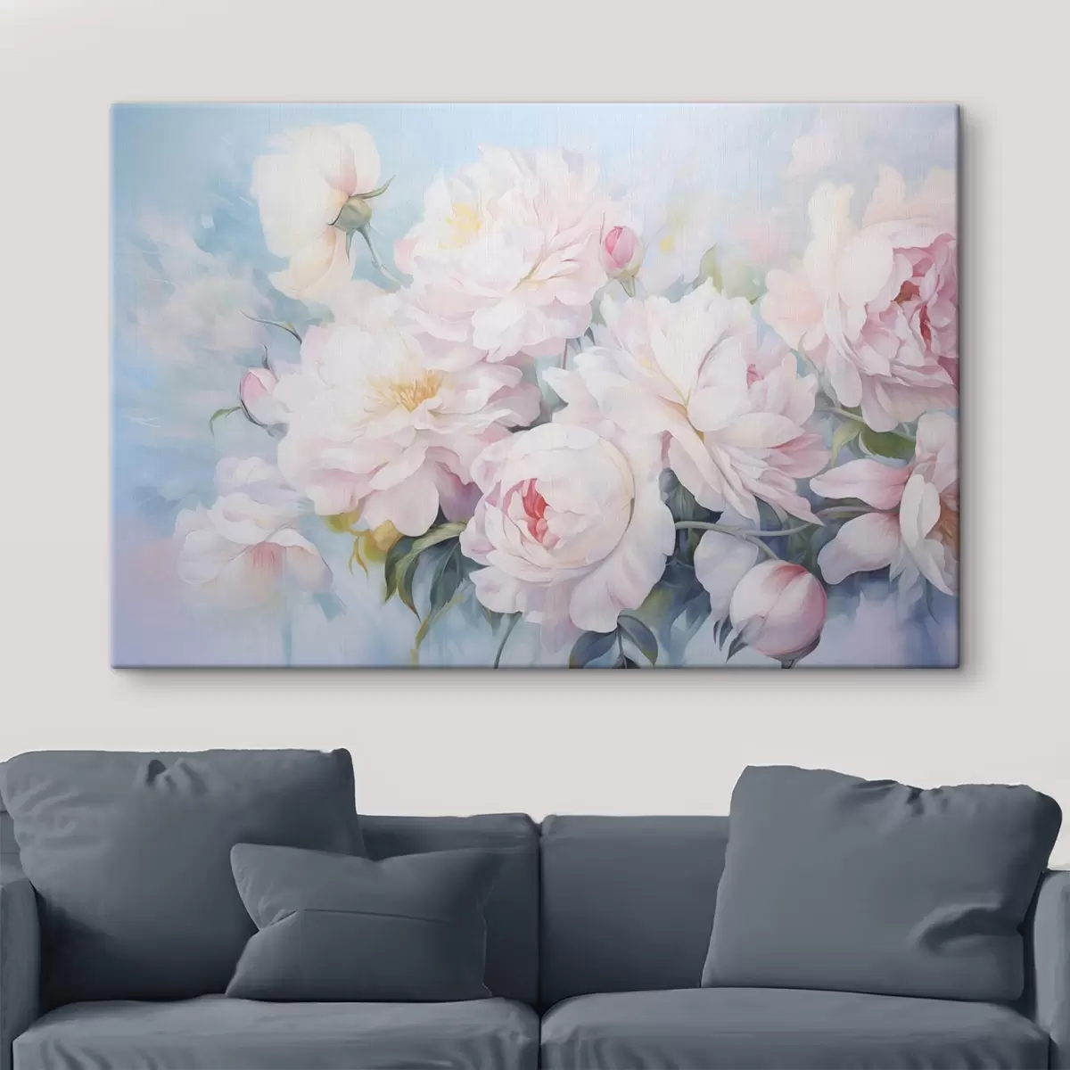 Vászonkép Finom rózsaszín pünkösdi rózsák égszínkék háttér előtt Nr s45813