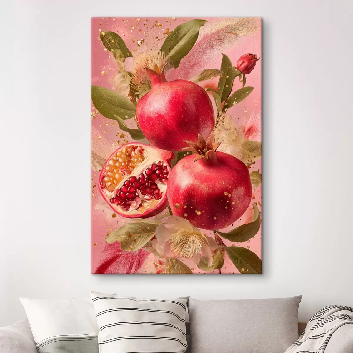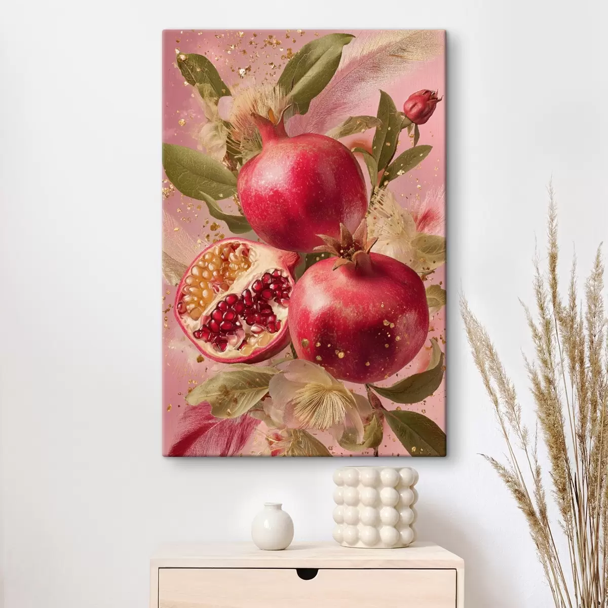 Vászonkép Érett gránátalmák rózsaszín alapon, levelekkel és arany pöttyökkel Nr s45868