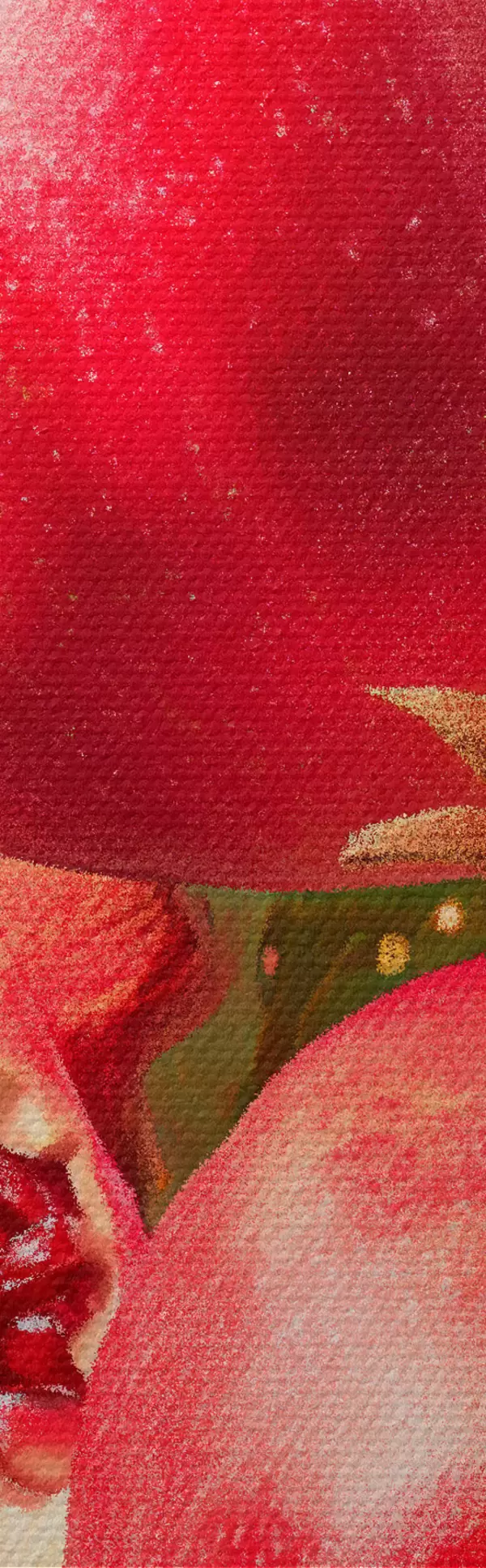 Vászonkép Érett gránátalmák rózsaszín háttérrel, levelekkel és foltokkal Nr s45868