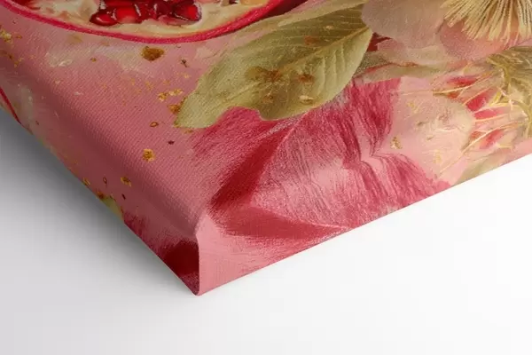 Vászonkép Érett gránátalmák rózsaszín alapon, levelekkel és arany pöttyökkel Nr s45868