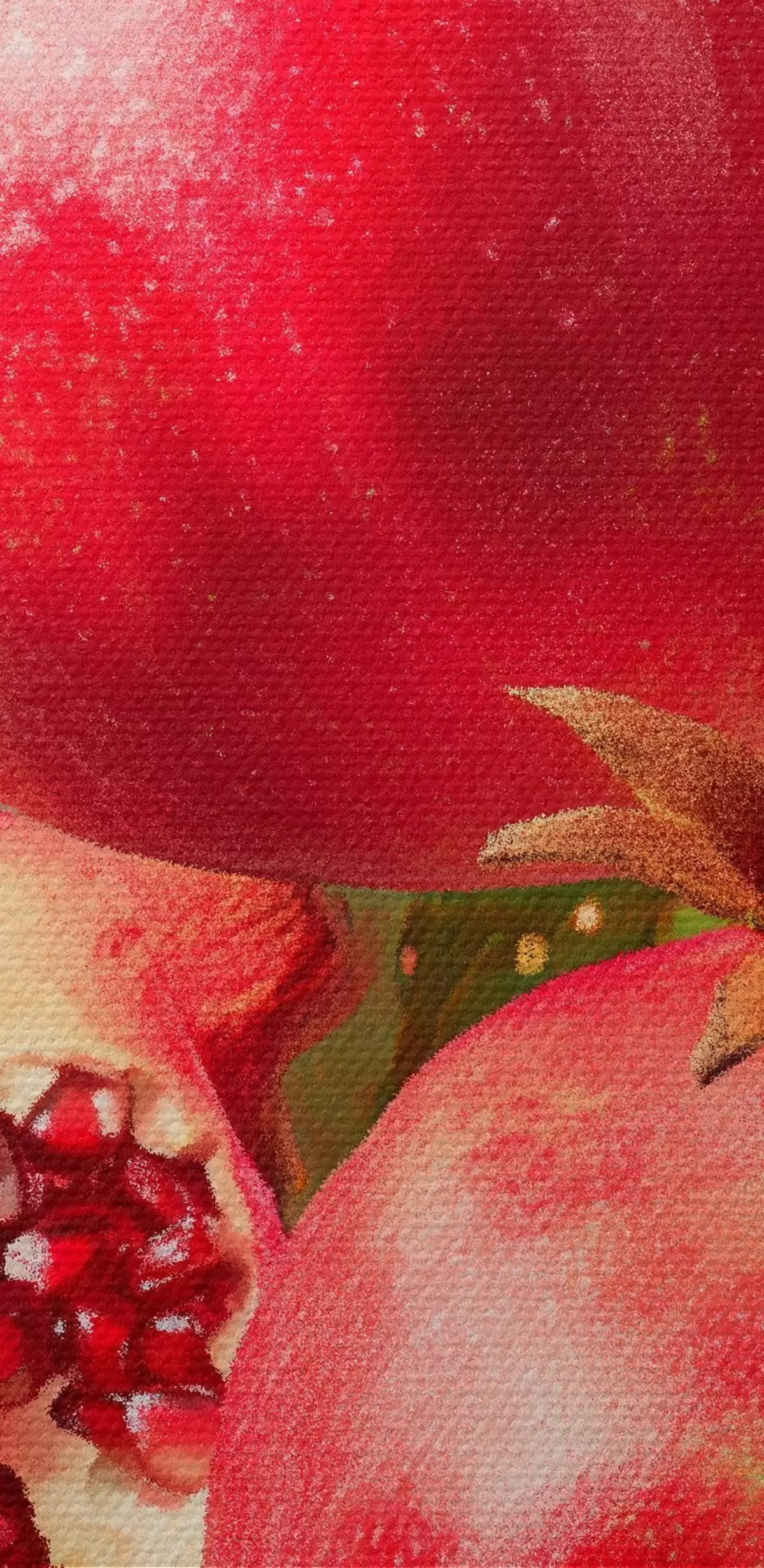 Vászonkép Érett gránátalmák rózsaszín háttérrel, levelekkel és foltokkal Nr s45868