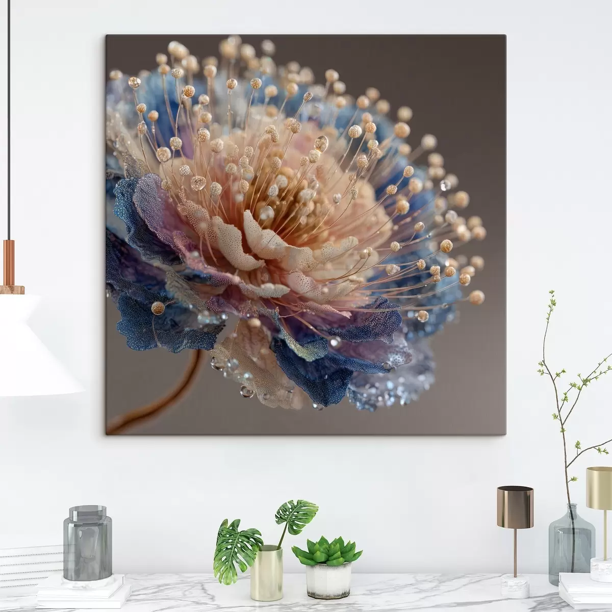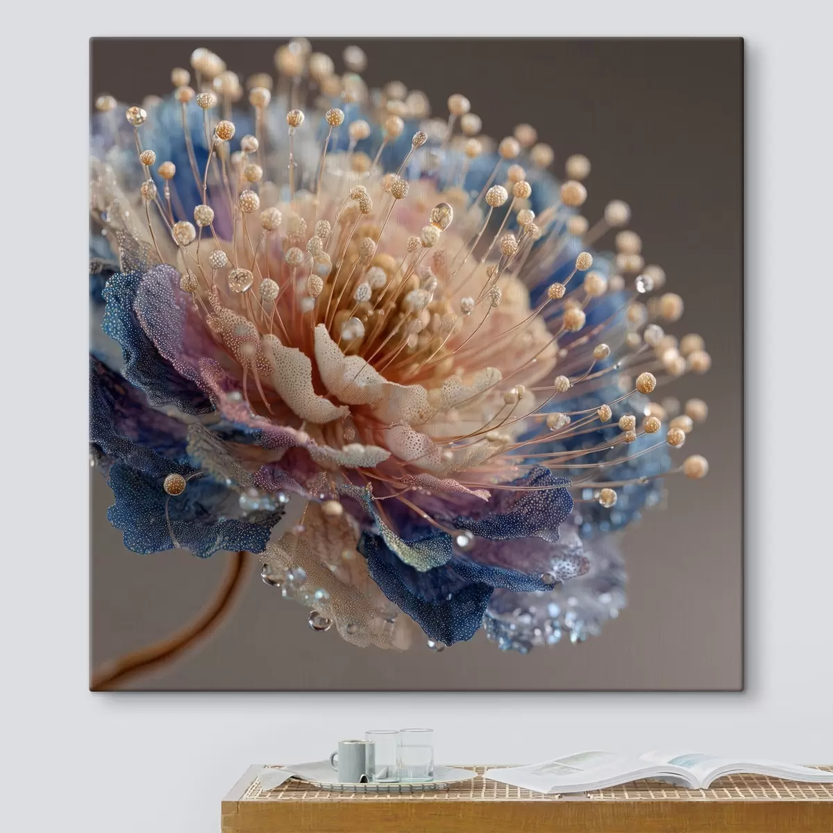 Vászonkép Gyöngyházfényű virág harmatcseppekkel, barack- és kék színű szirmokkal Nr s45911