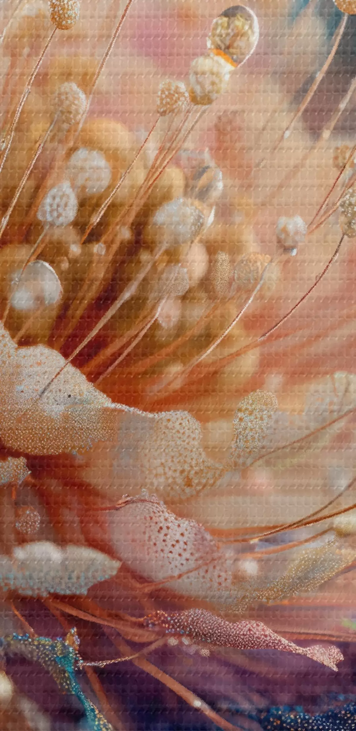 Vászonkép Gyöngyházfényű virág harmatcseppekkel, barack- és kék színű szirmokkal Nr s45911