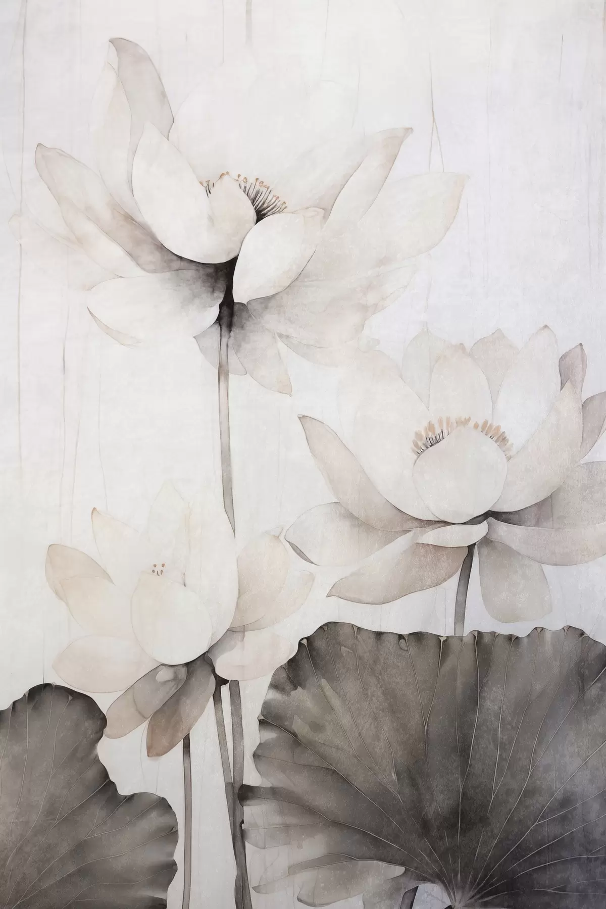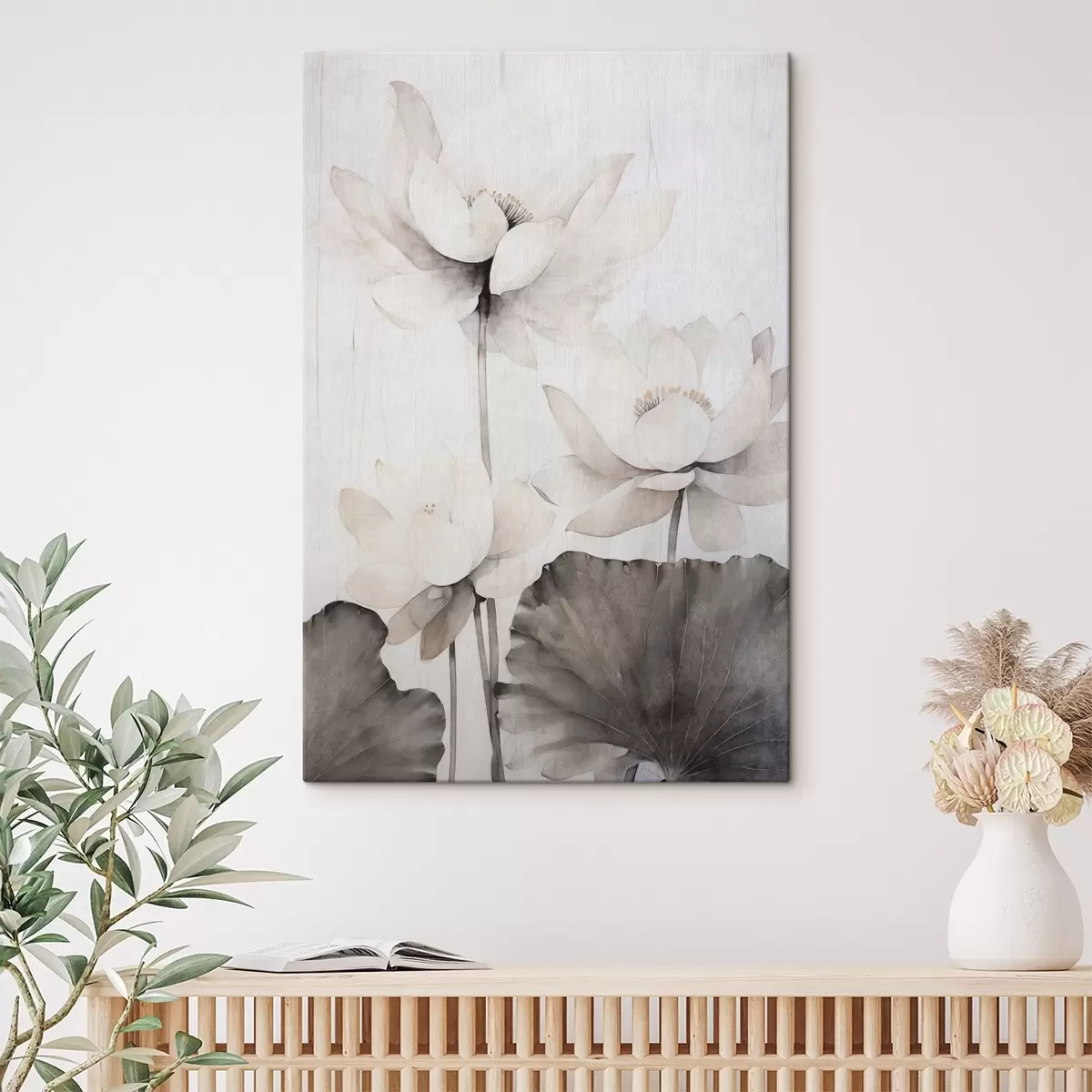 Vászonkép Fehér textúrájú lótuszvirágok sötét levelekkel, világos háttérrel, minimalista dizájn Nr s45936