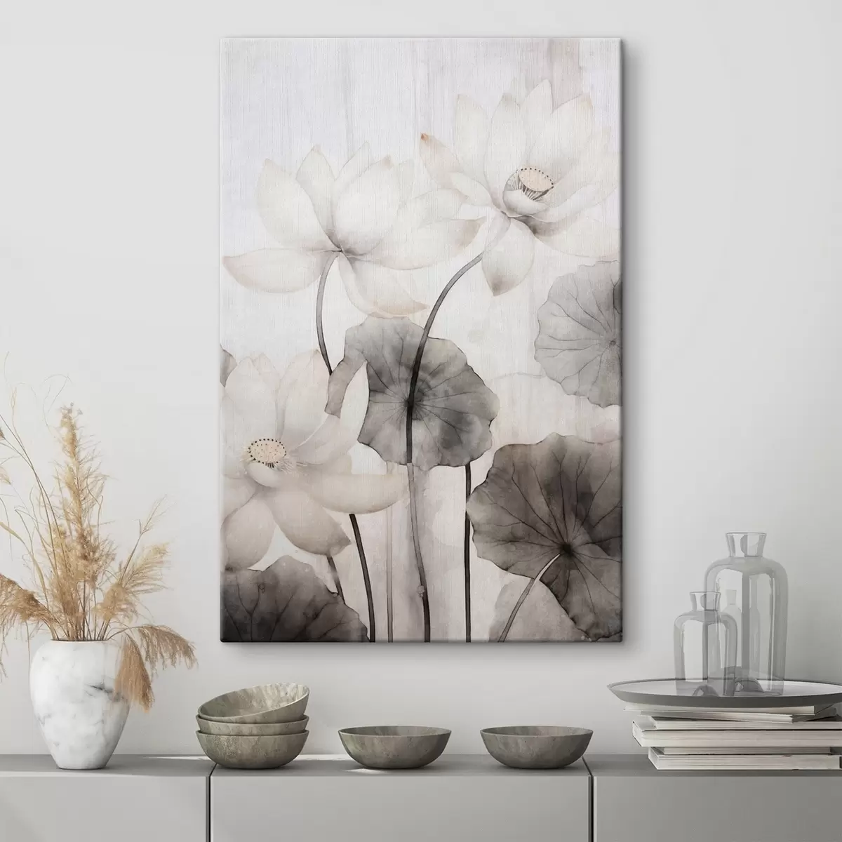 Vászonkép Fehér textúrájú lótuszvirágok sötét levelekkel, világos háttérrel, minimalista dizájn Nr s45937