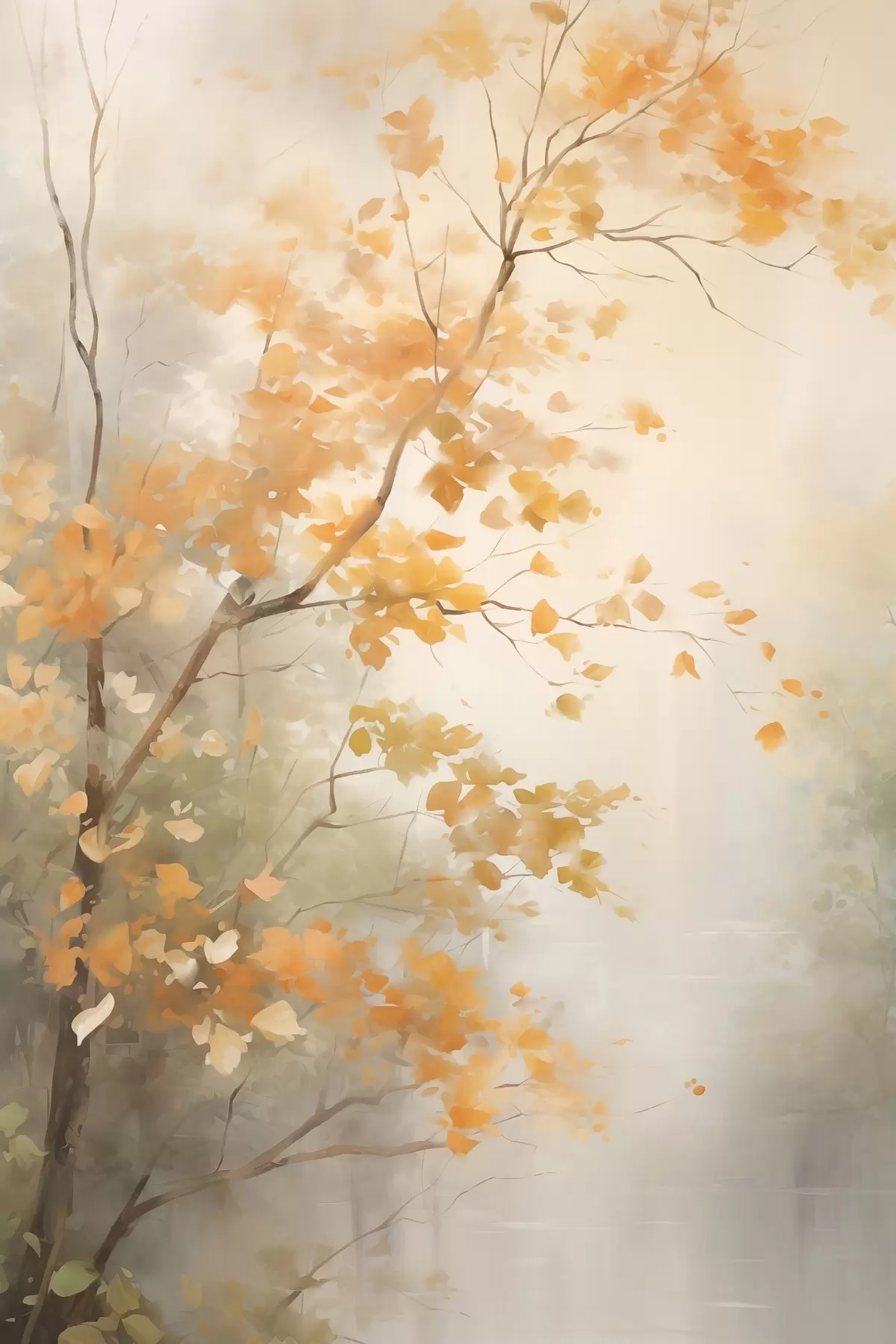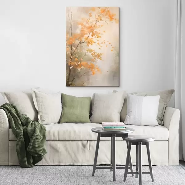 Vászonkép Őszi faágak narancssárga levelekkel egy lágy fényű erdőben Nr s45940