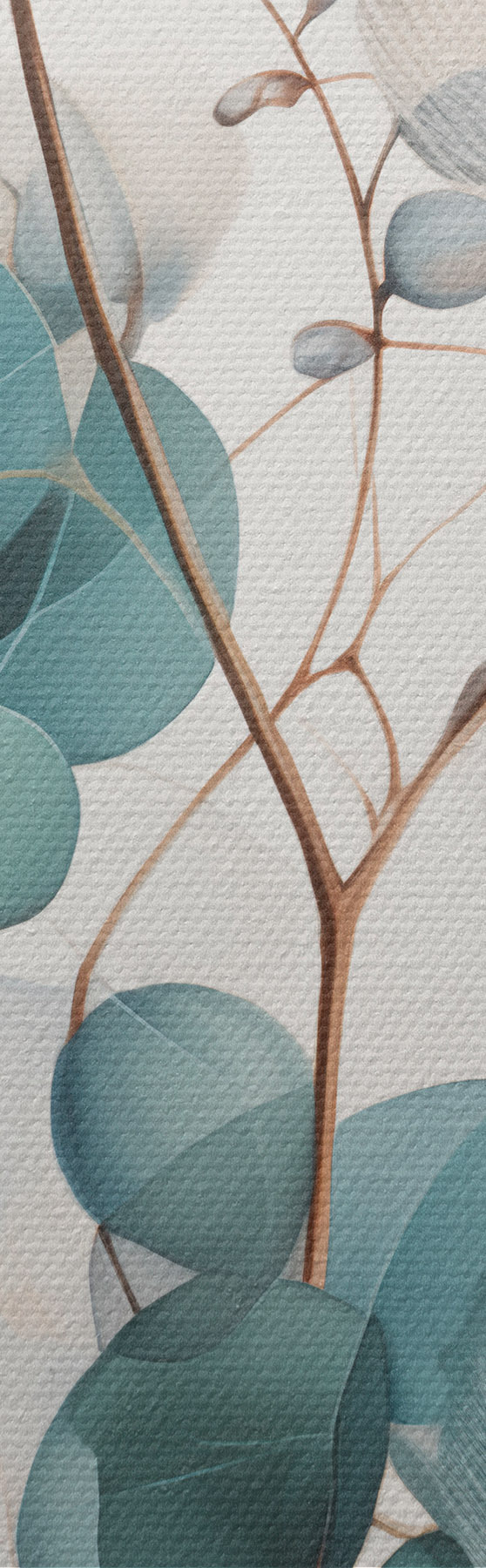Vászonkép Eukaliptusz absztrakt virágok fehér szirmokkal, halványzöld levelekkel az ágakon Nr s45946