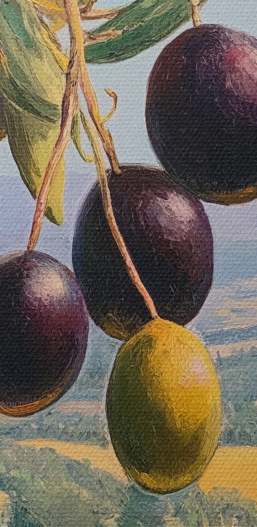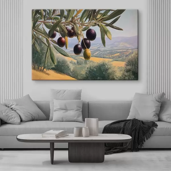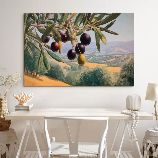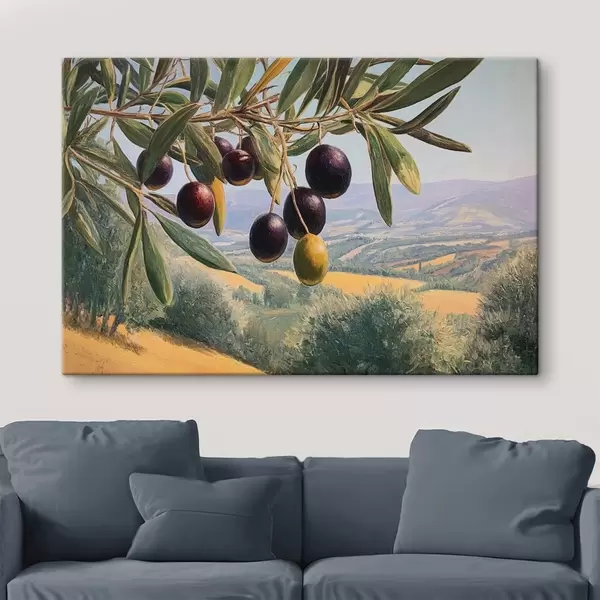 Vászonkép Olajág sötét gyümölcsökkel nyári táj előtt Nr s46150