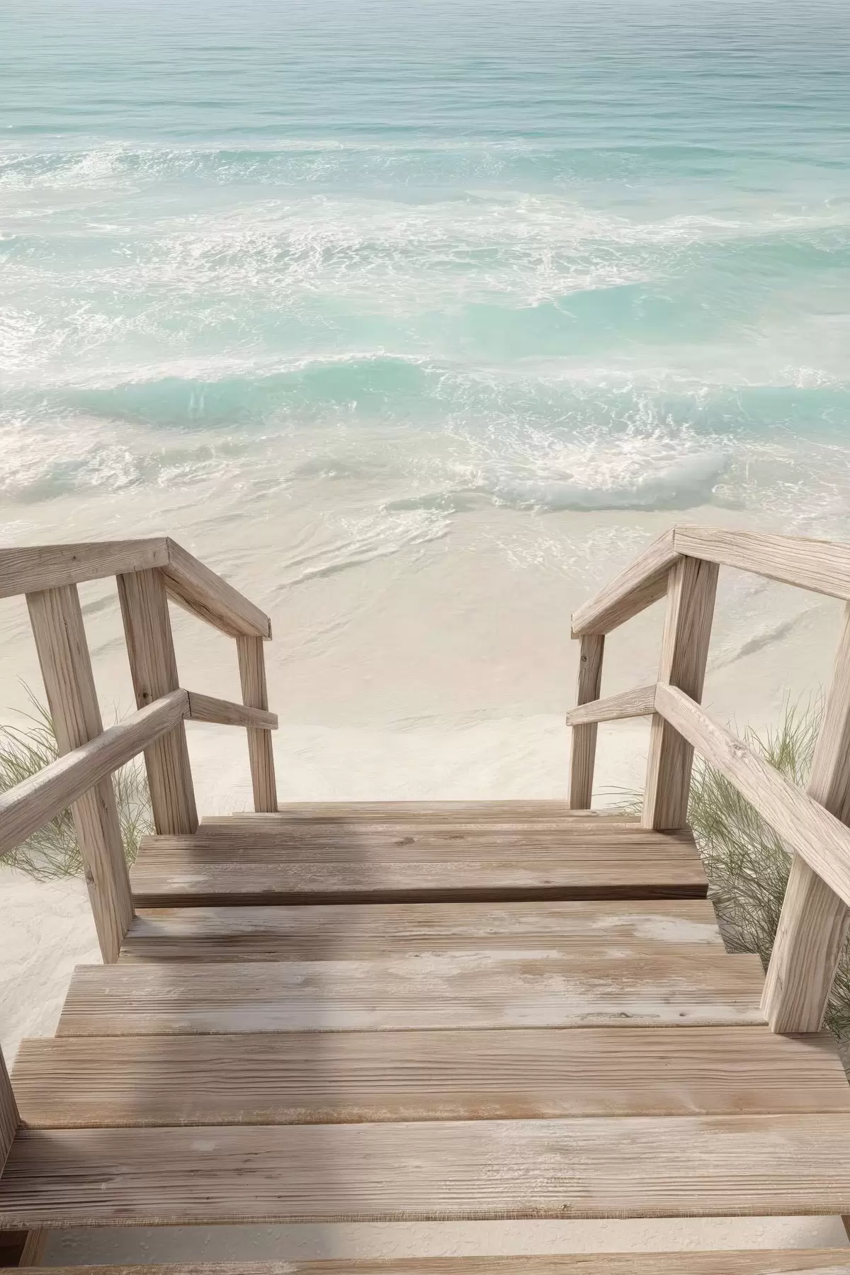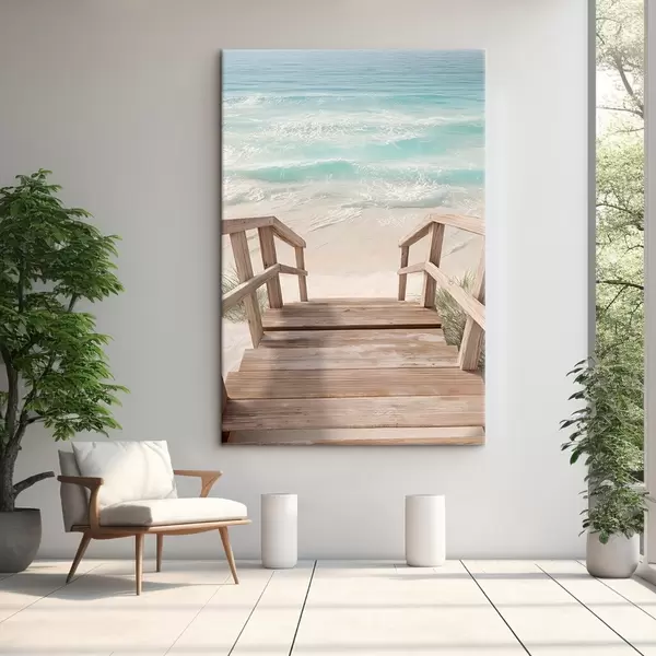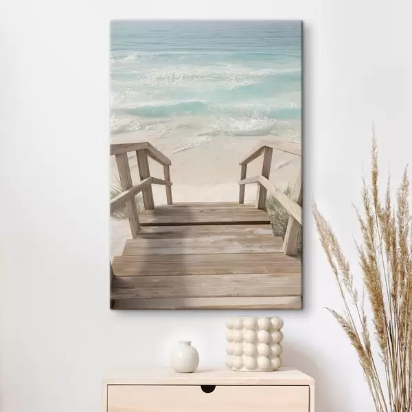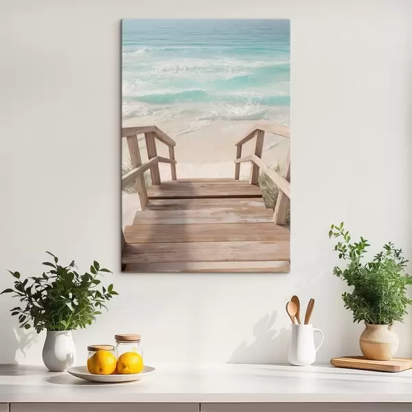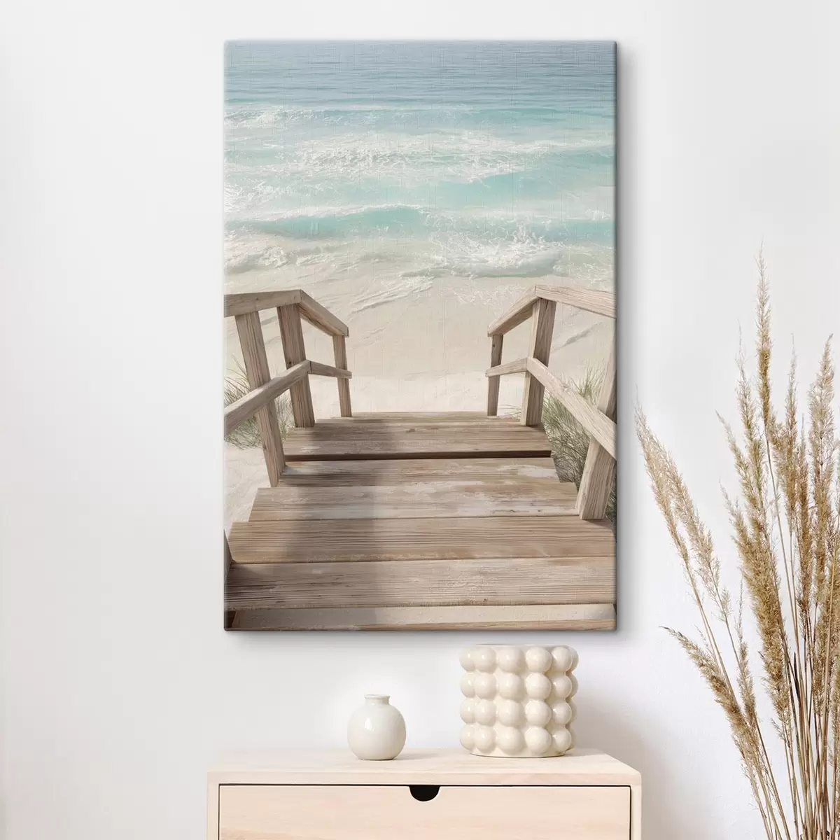 Vászonkép Fából készült lépcső, amely egy türkizkék tengerpartra vezet Nr s46163