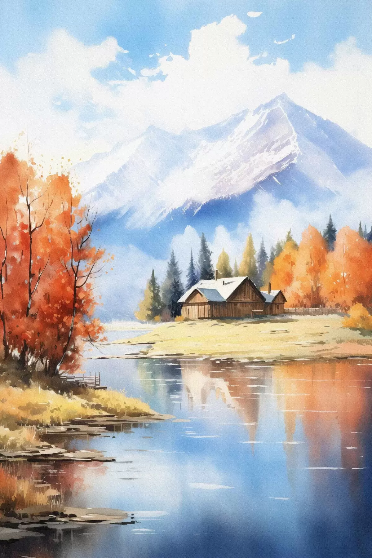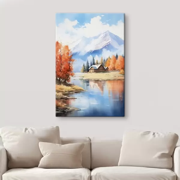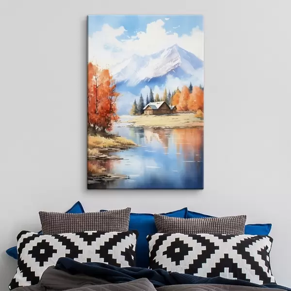 Vászonkép Őszi táj a tó partján, házzal és hegyekkel Nr s46184