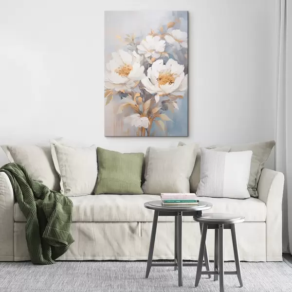 Vászonkép Fehér pünkösdi rózsák sárga közepekkel és levelekkel, lágy ecsetvonások, világoskék háttér, virágkompozíció Nr s46270