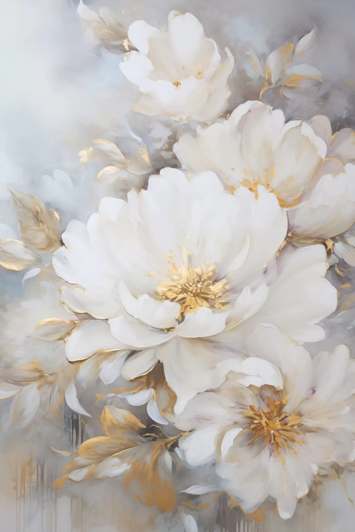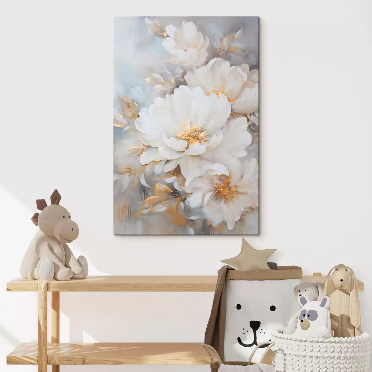 Vászonkép Fehér pünkösdi rózsák sárga közepekkel és levelekkel, lágy ecsetvonások, világoskék háttér, virágkompozíció Nr s46271