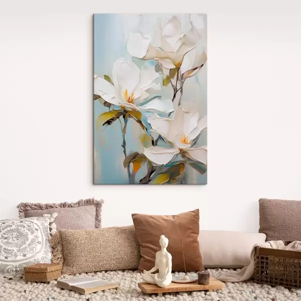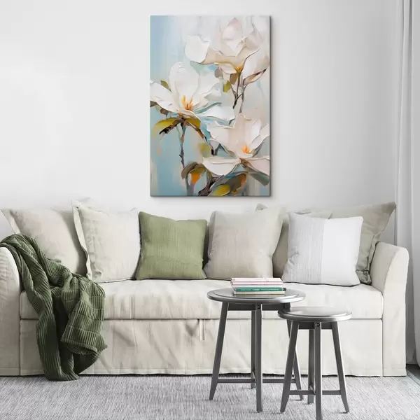Vászonkép Fehér magnólia virágok, világoskék háttér lágy ecsetvonásokkal, olajfestmény stílus, impasto textúra Nr s46276