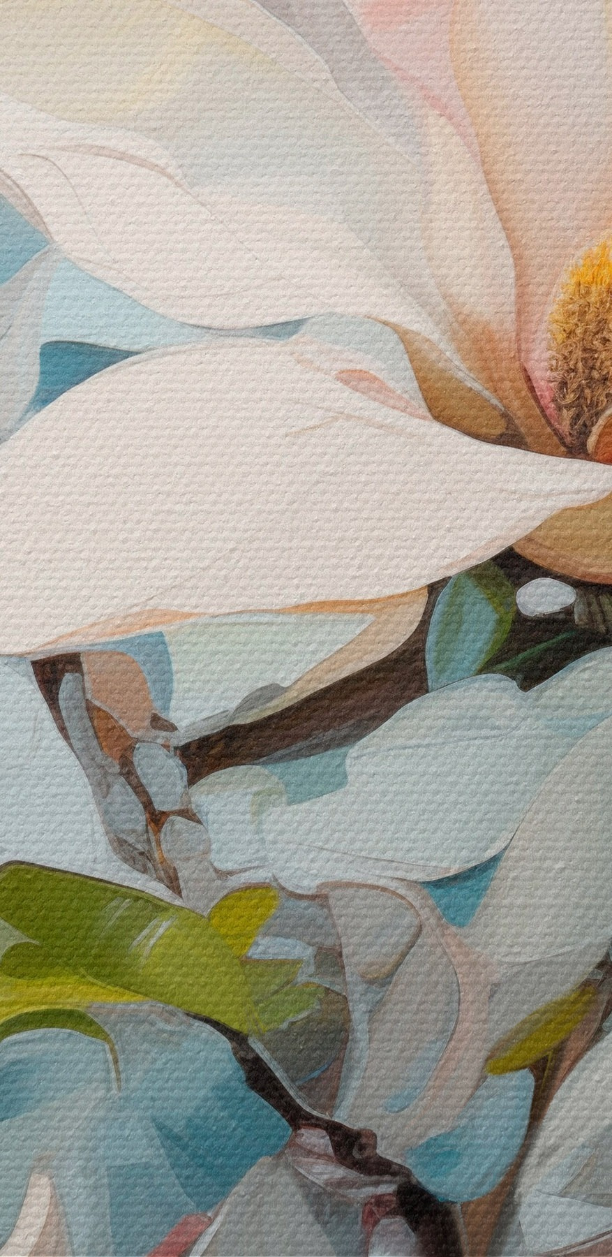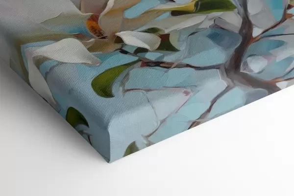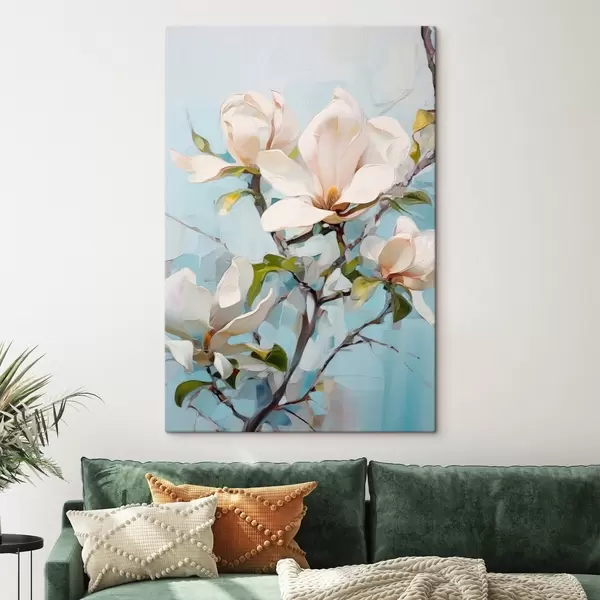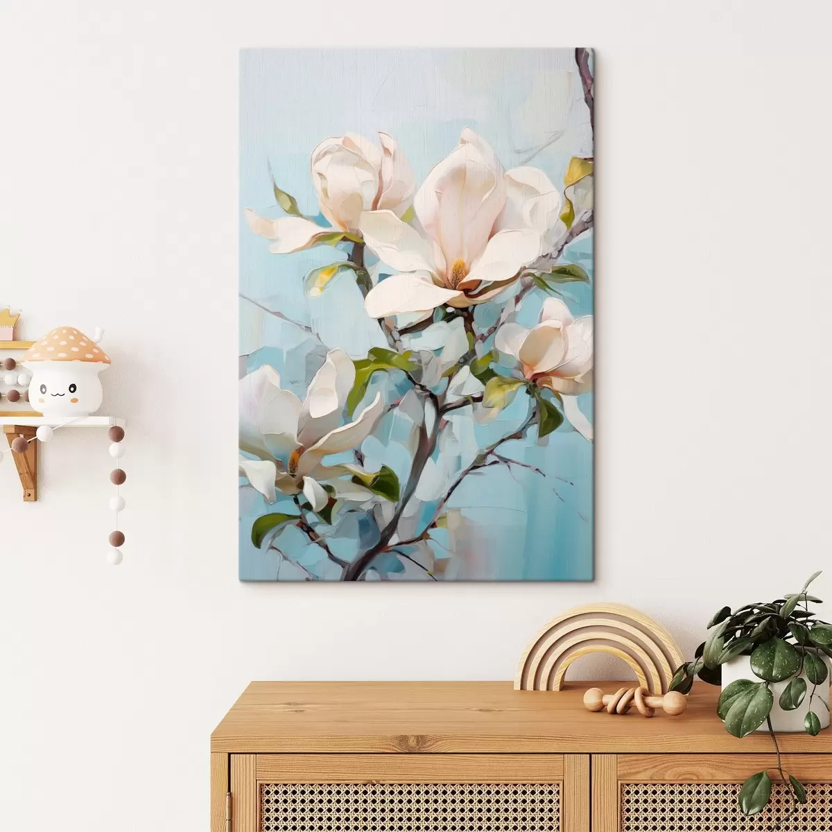 Vászonkép Fehér magnólia virágok, világoskék háttér lágy ecsetvonásokkal, olajfestmény stílus, impasto textúra Nr s46277