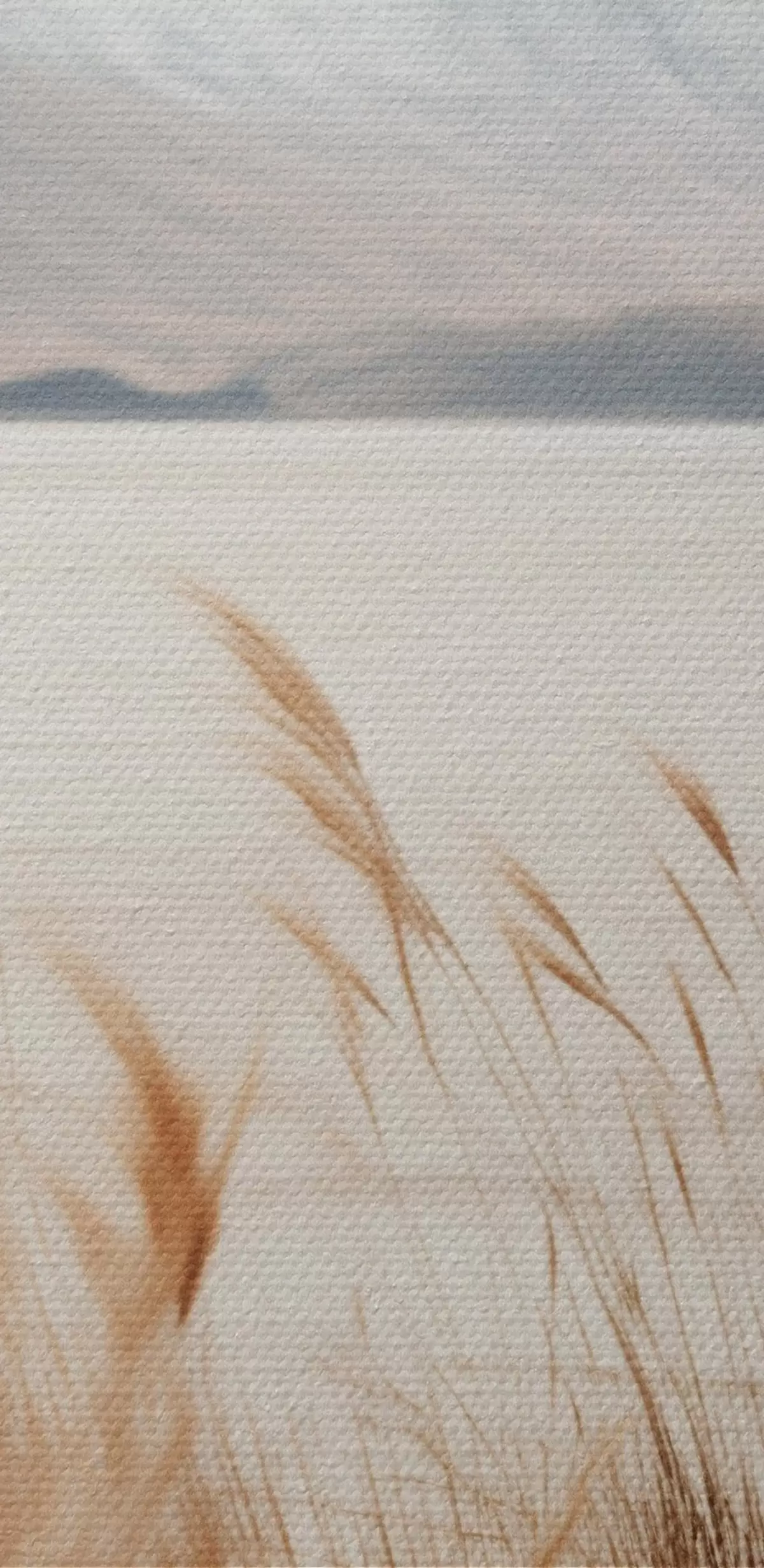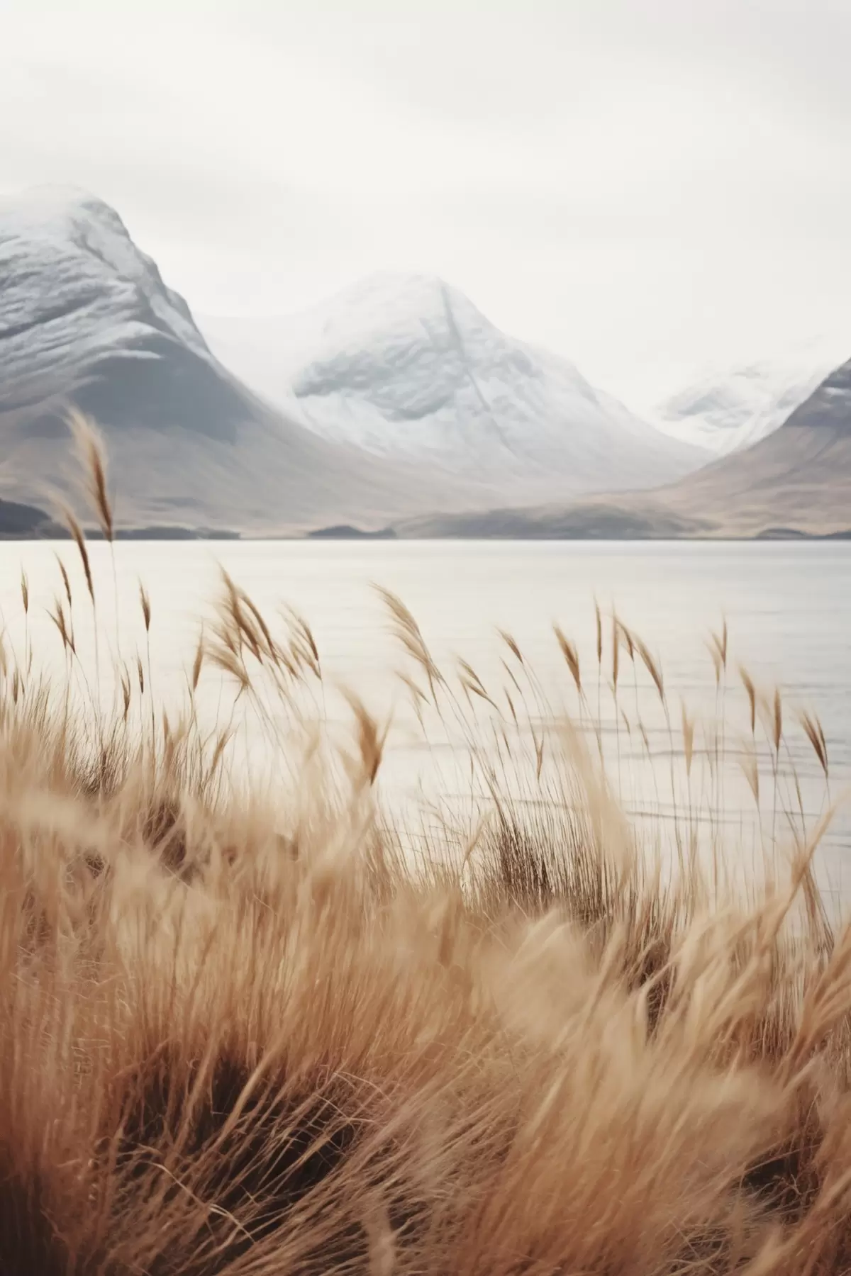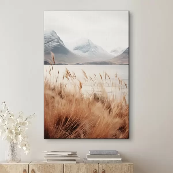 Vászonkép Pampas fű mező egy tó előtt, háttérben havas hegyekkel, lágy fényben Nr s46282