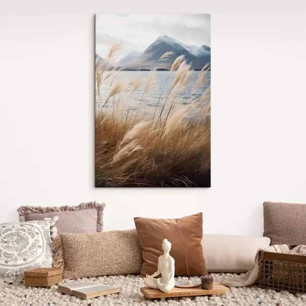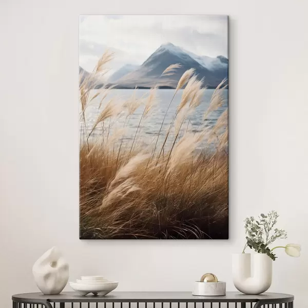 Vászonkép Pampas fű, háttérben tóval és hegyekkel, lágy megvilágítás, tompított színek, naturalisztikus stílus Nr s46283