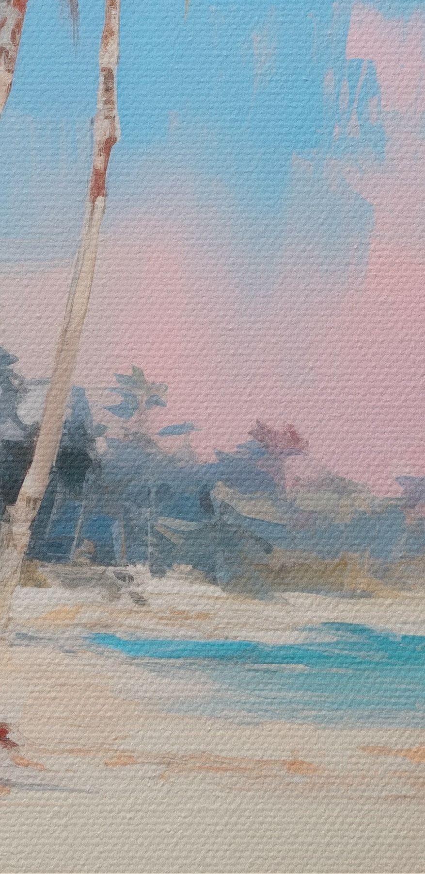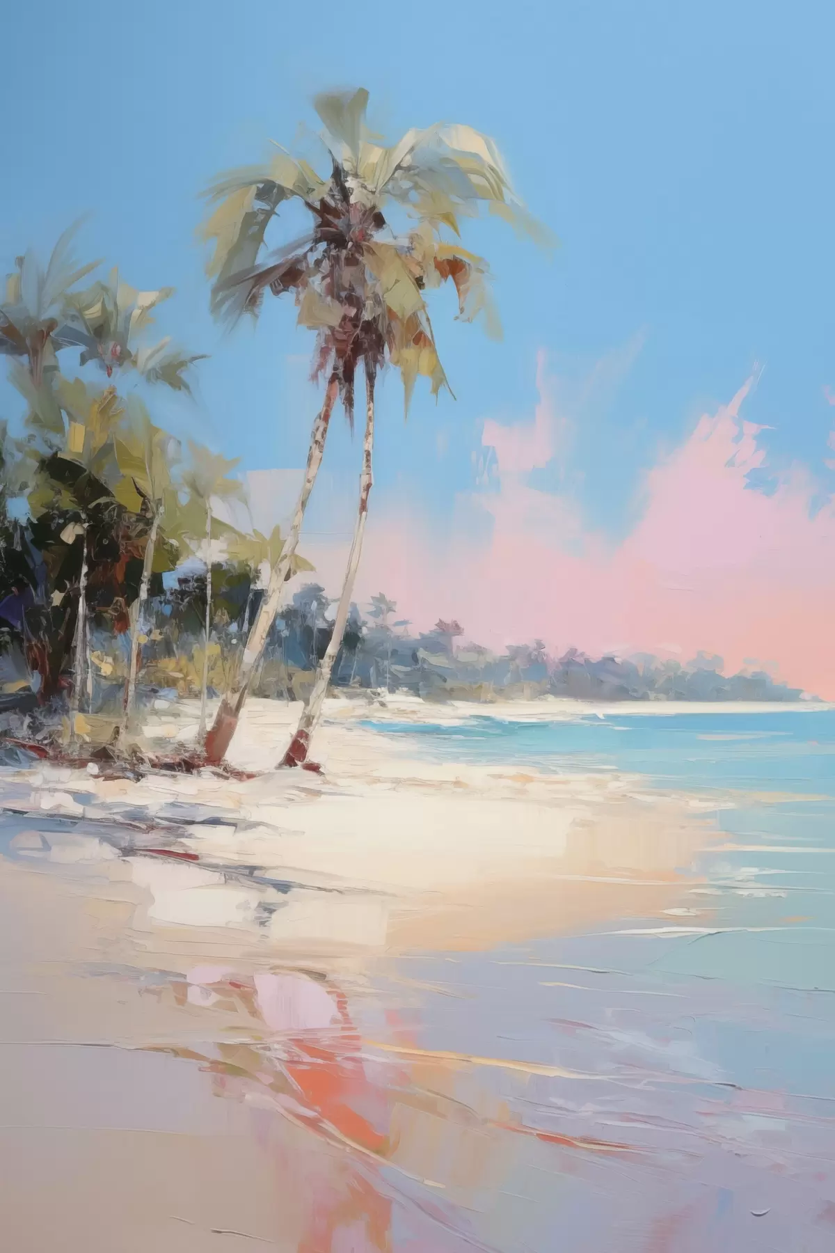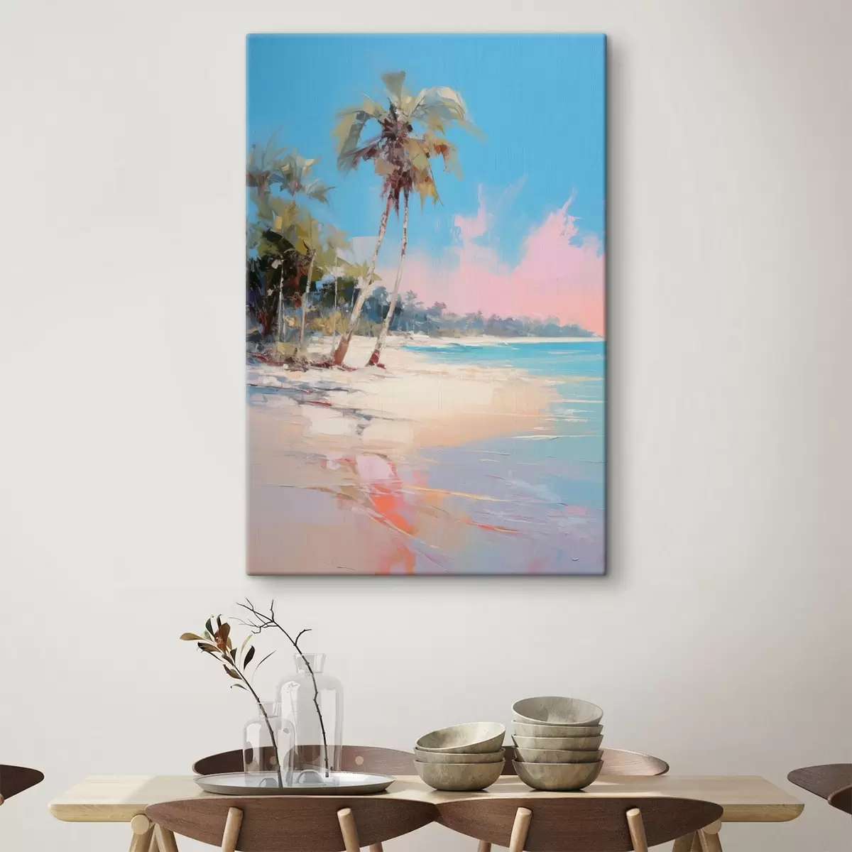 Vászonkép Absztrakt trópusi strand fehér homokkal és pálmafákkal, kék ég fehér felhőkkel Nr s46285