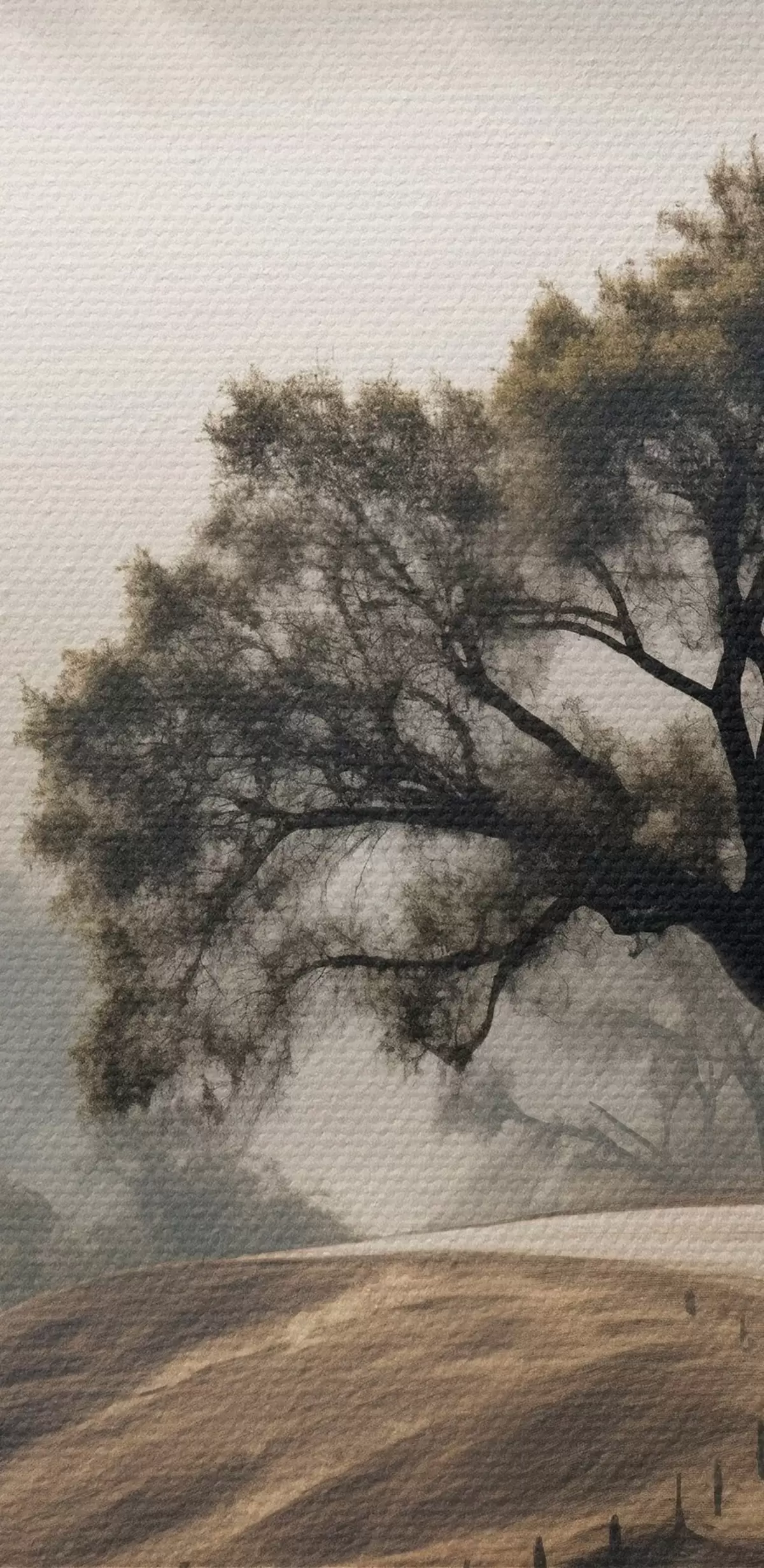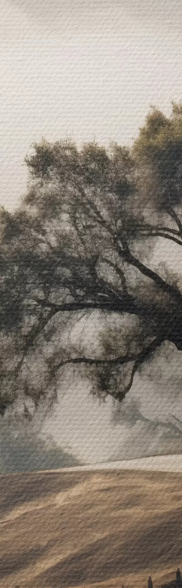 Vászonkép Kanyargós út hullámzó dombok között, előtérben egy fa, háttérben köd és hegyek Nr s46288