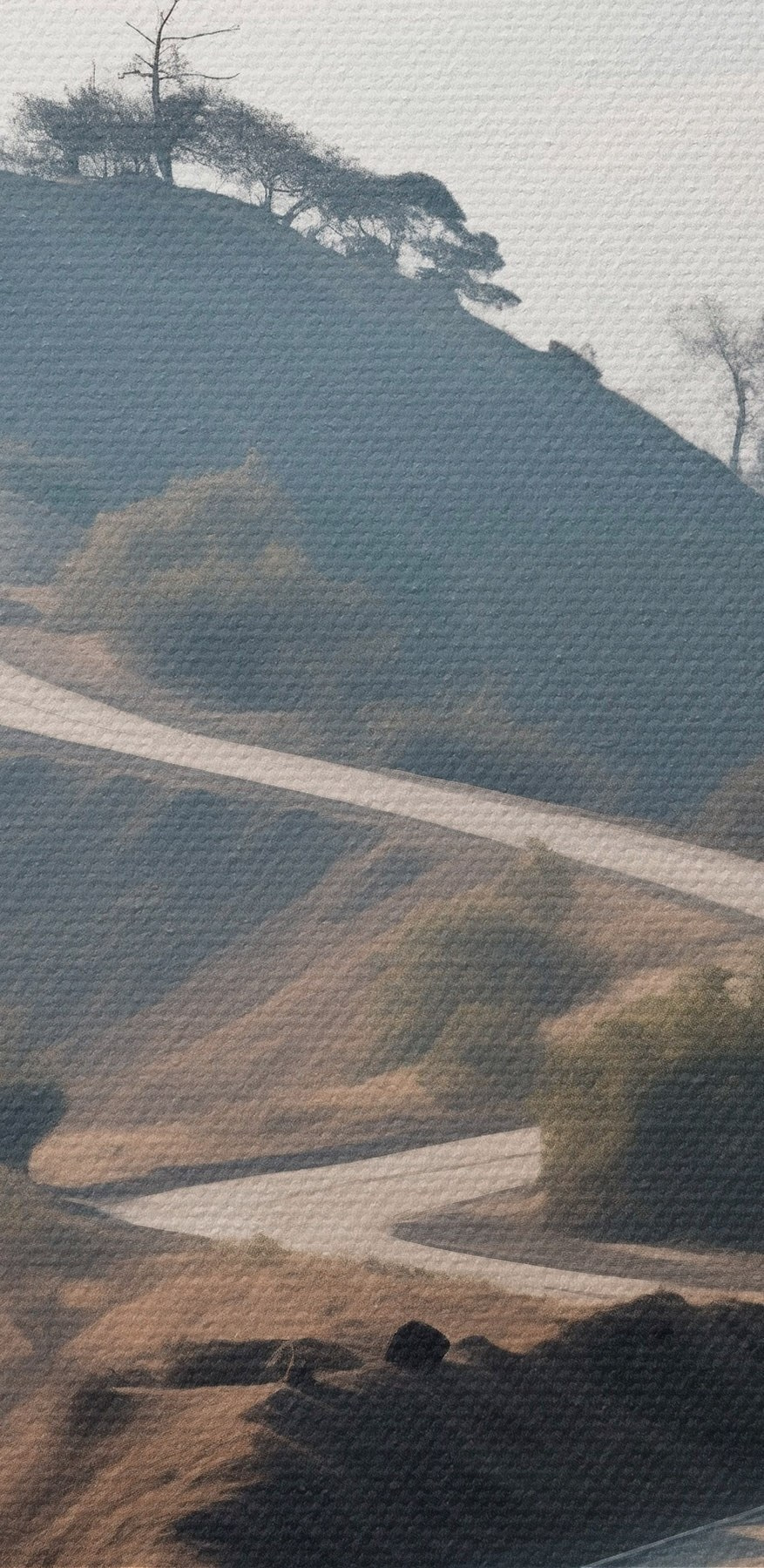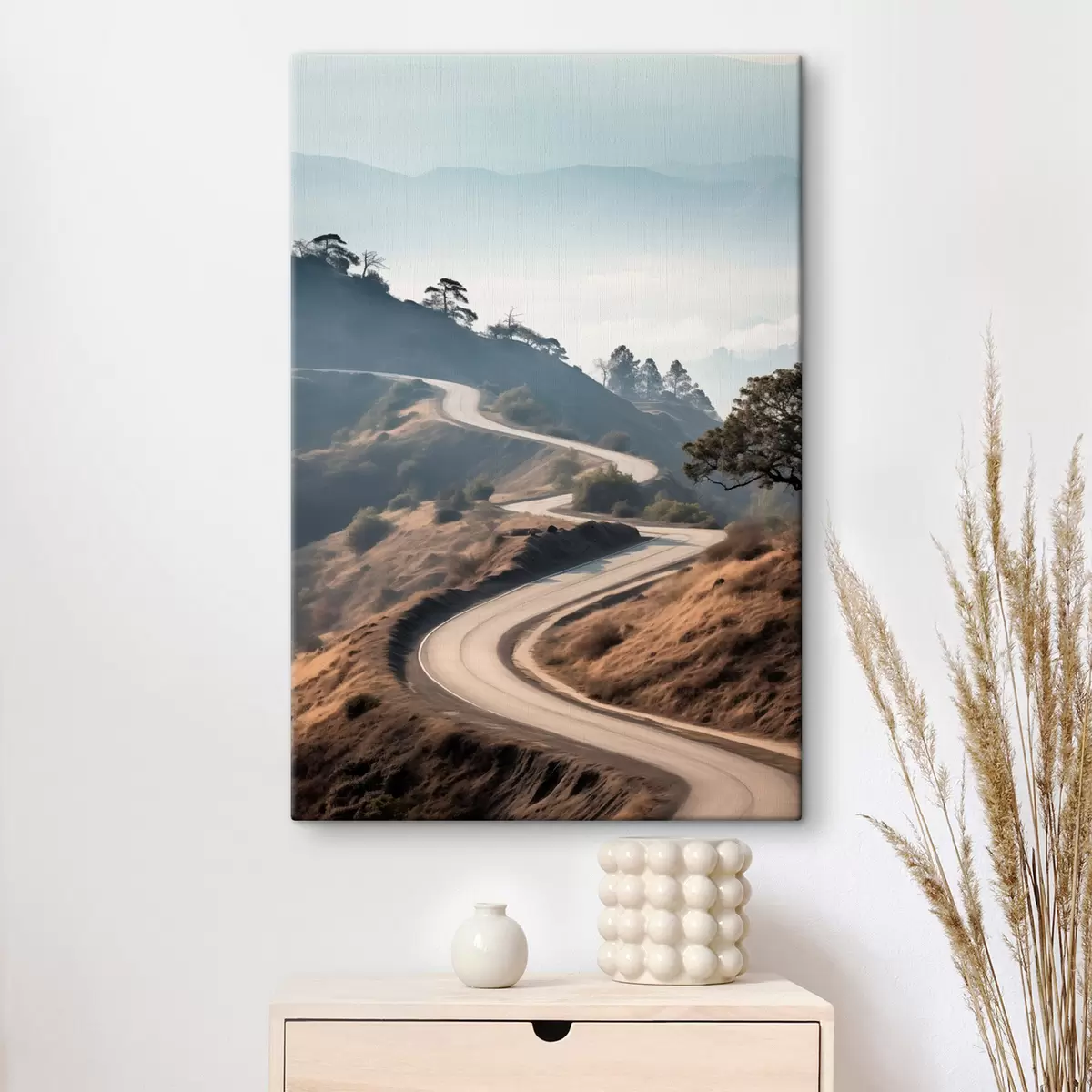 Vászonkép Kanyargós út dombos tájban, száraz fűvel, tiszta égbolttal és a távolban látható hegyekkel. Nr s46289