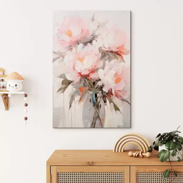 Vászonkép Rózsaszín és fehér pünkösdi rózsák csokor üvegvázában, lágy ecsetvonások, pasztell színek, semleges háttér Nr s46295