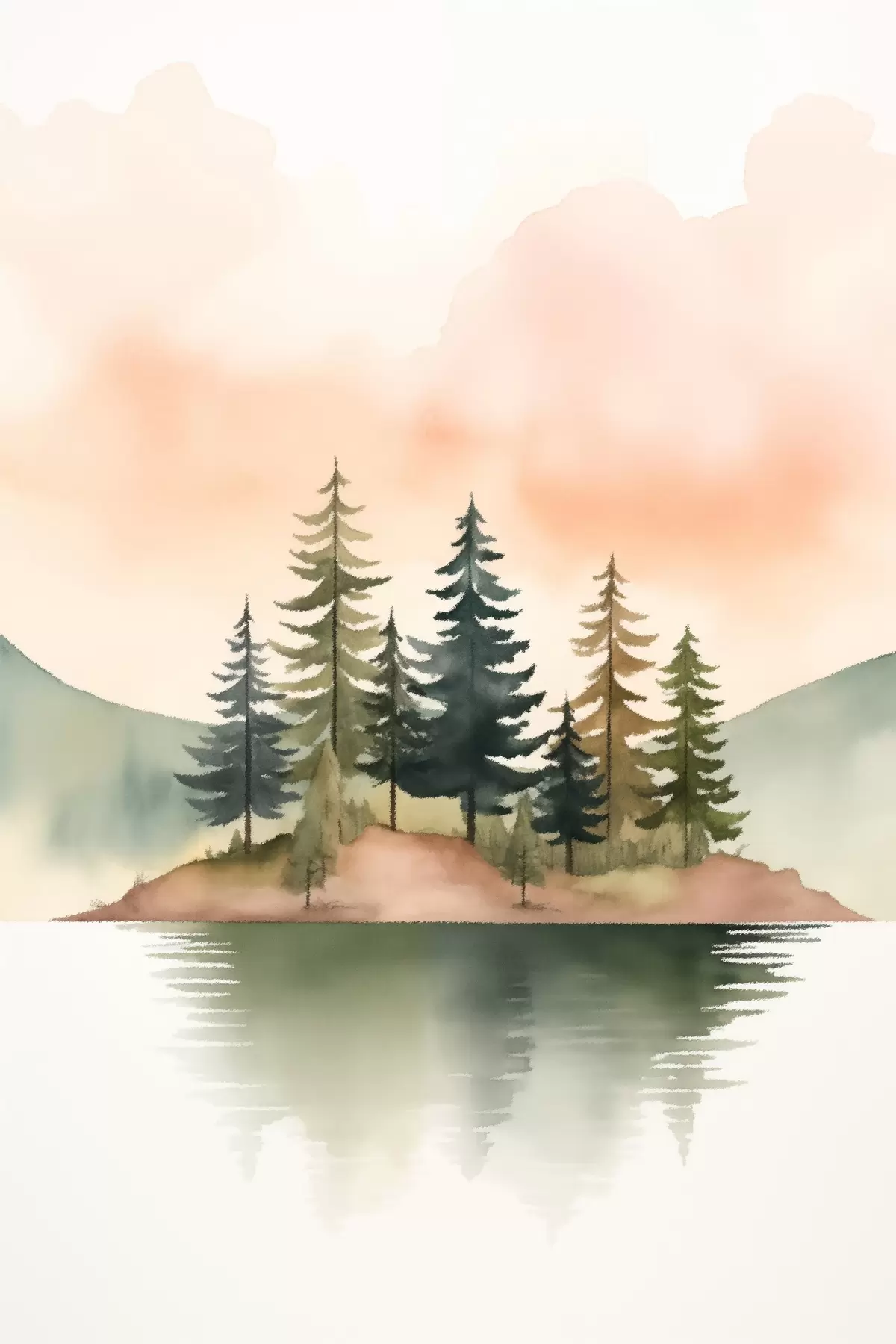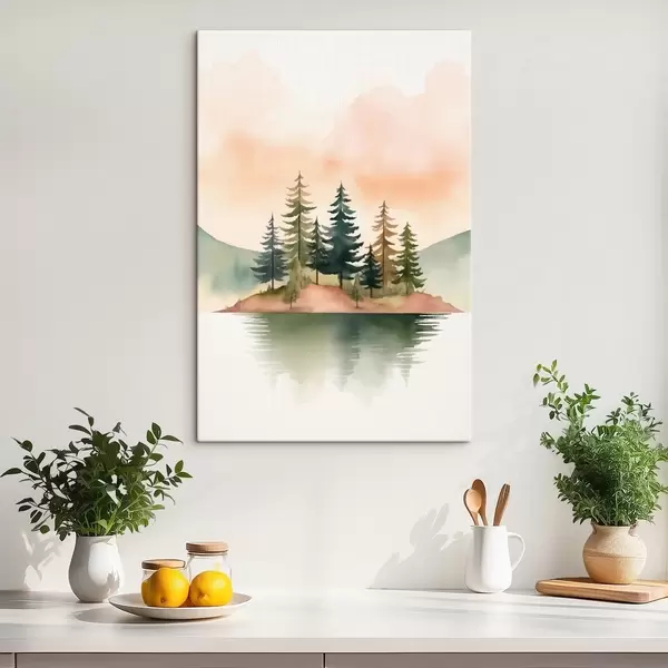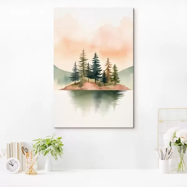 Vászonkép Akvarell fenyők ködös szigeten, lágy barack színű égbolton Nr s46505
