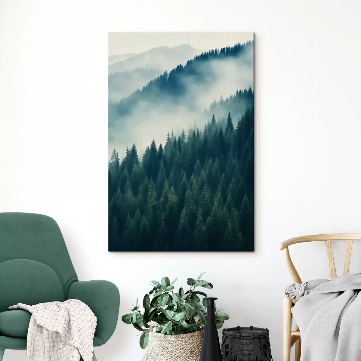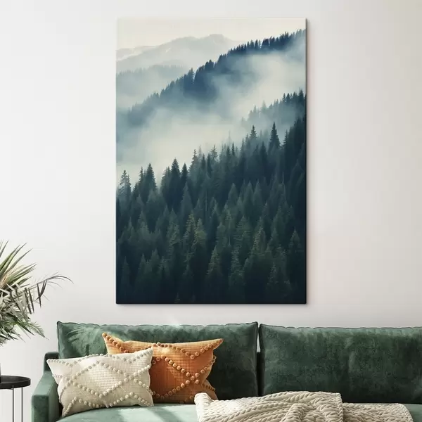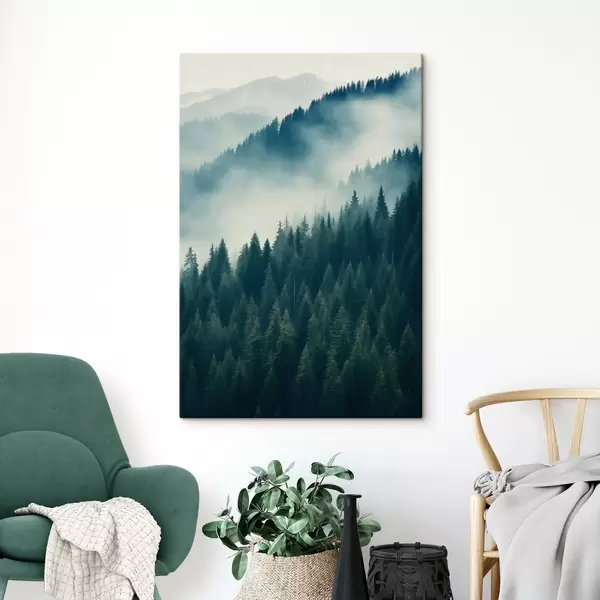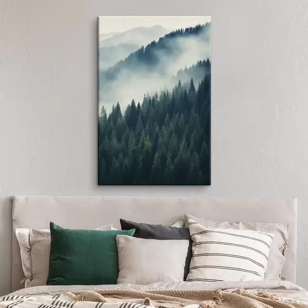 Vászonkép Köd a tűlevelű lejtők felett, mélyzöld árnyalatok Nr s46516