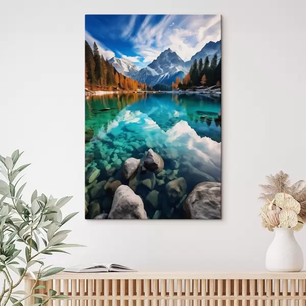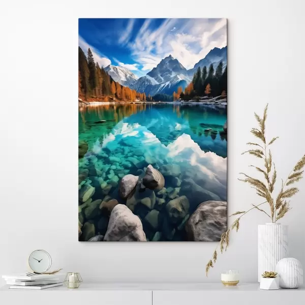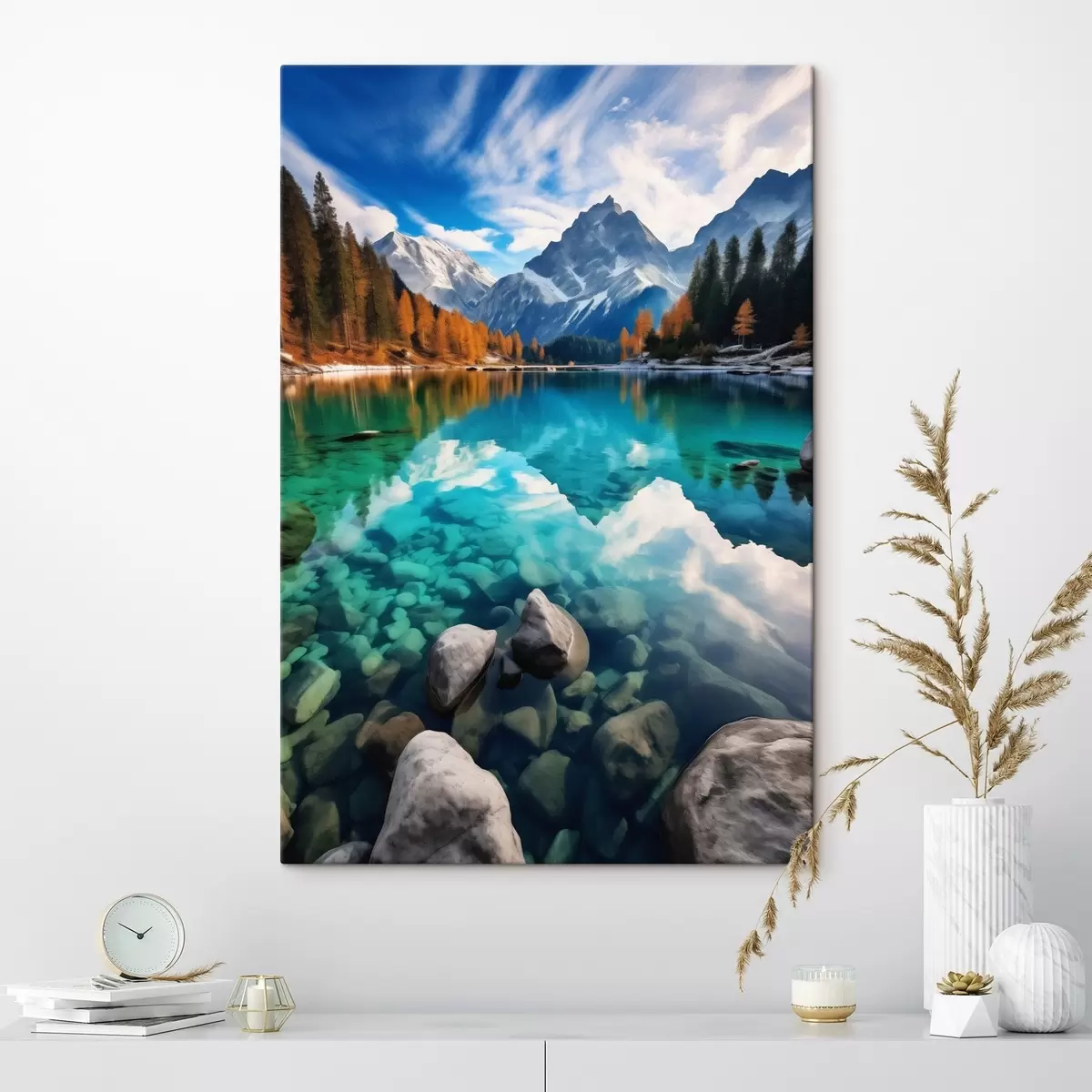 Vászonkép Törpefenyőkkel szegélyezett, türkizkék vizű hegyi tó Nr s46517