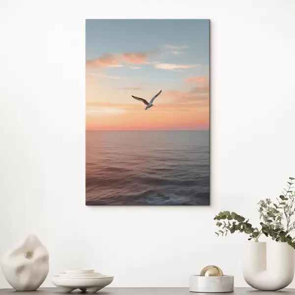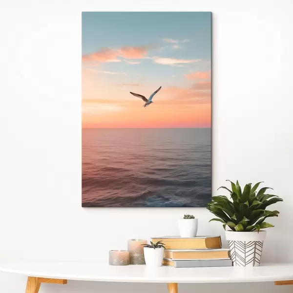 Vászonkép Sirály a tenger felett, rózsaszín-barack színű naplementében Nr s46520