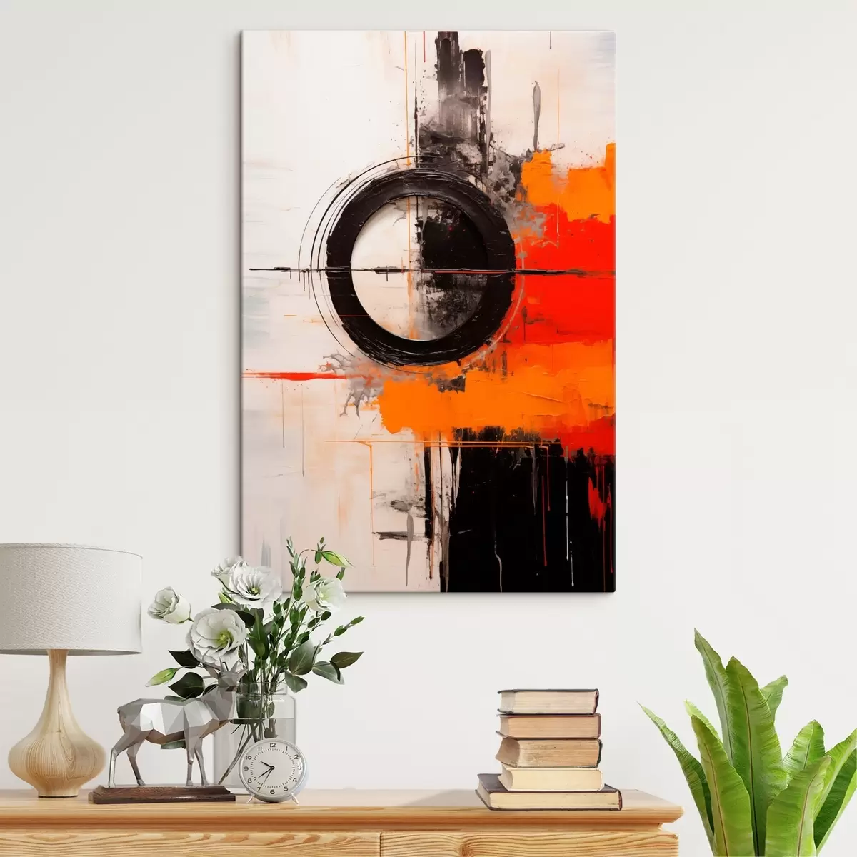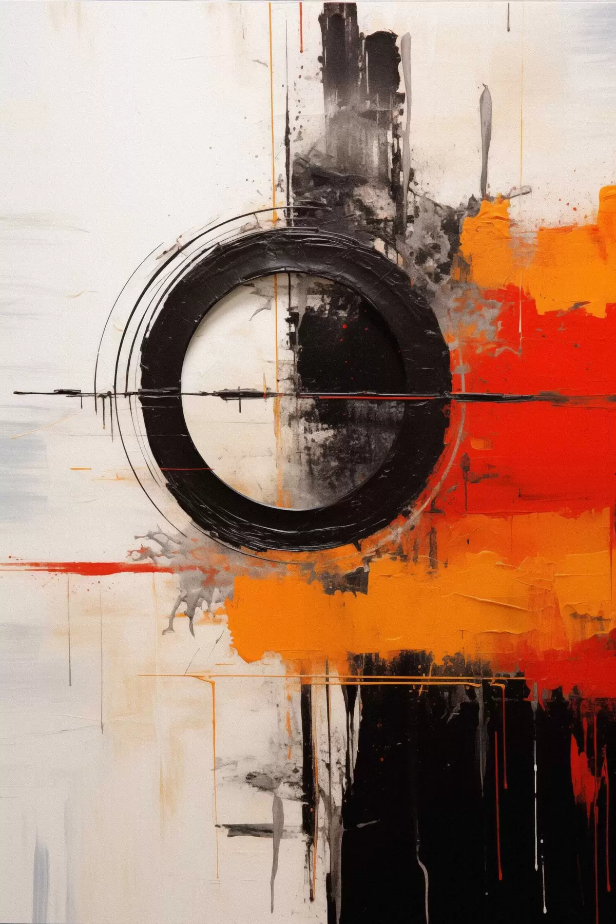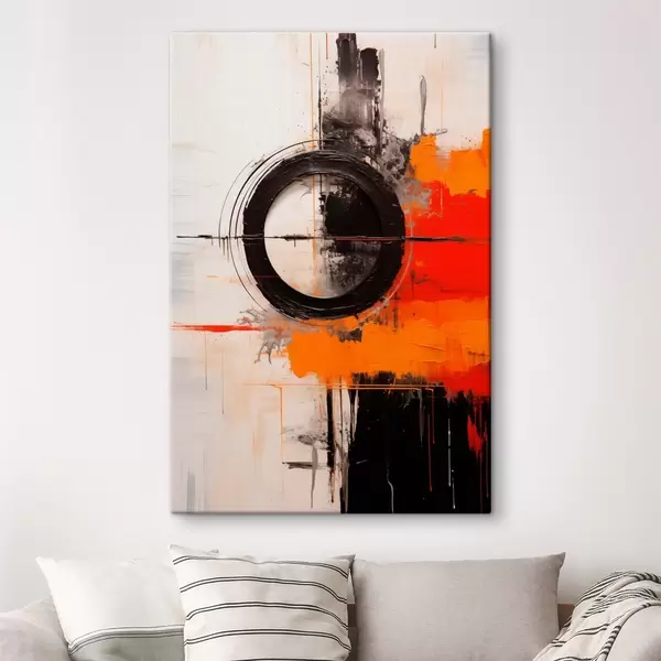 Vászonkép Fekete kör fehér alapon, narancssárga vonások és fröccsenések Nr s46549