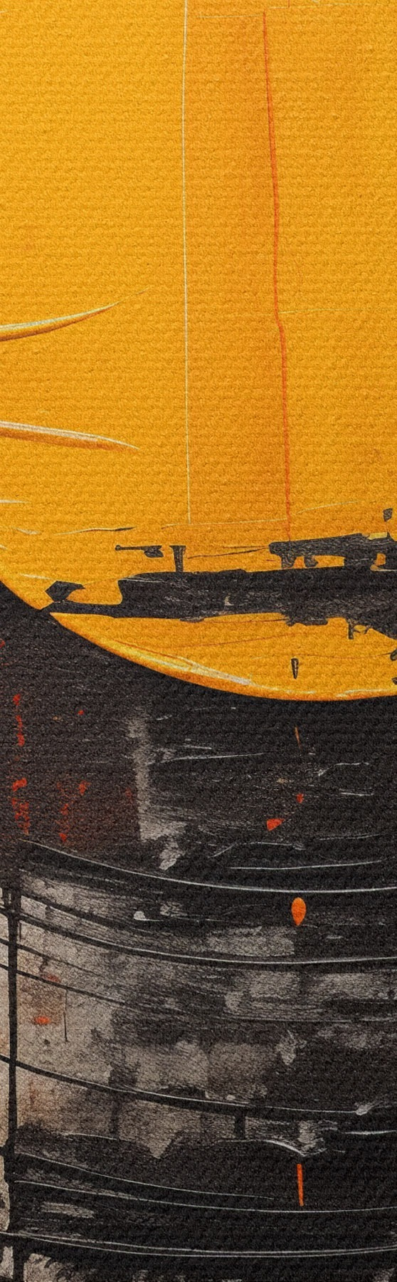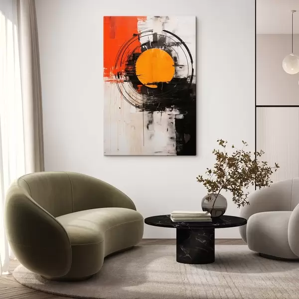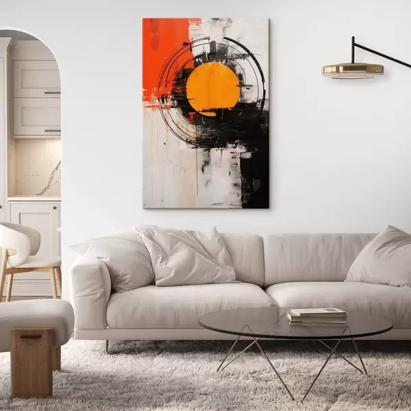 Vászonkép Narancssárga korong fekete gyűrűben, ecsetvonások és fröccsenések Nr s46550