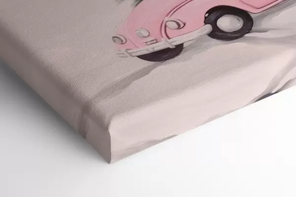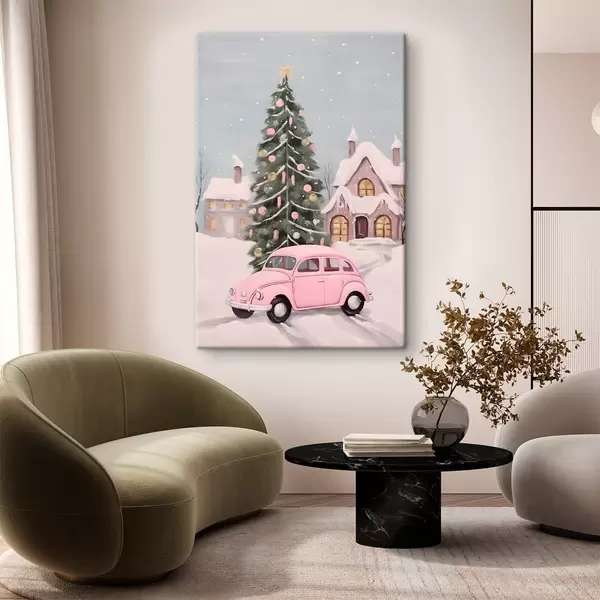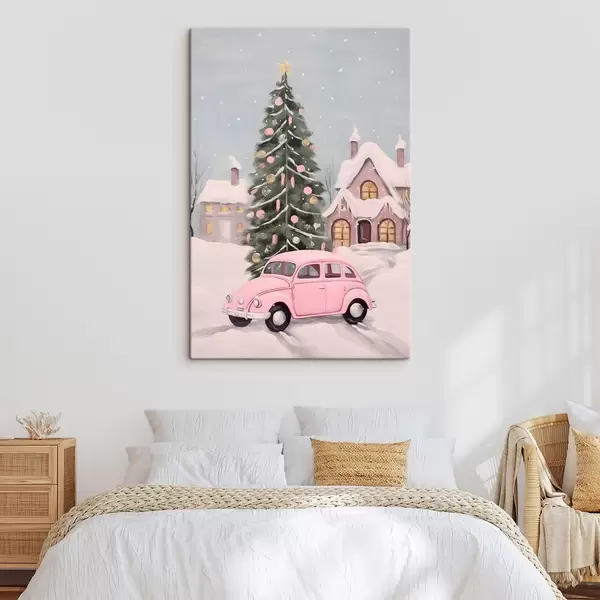 Vászonkép Rózsaszín autó és feldíszített karácsonyfa a ház előtt Nr s46621