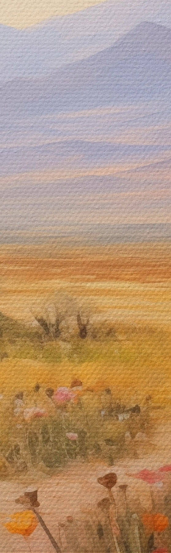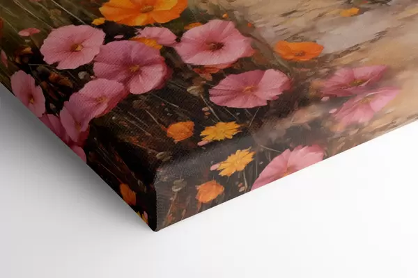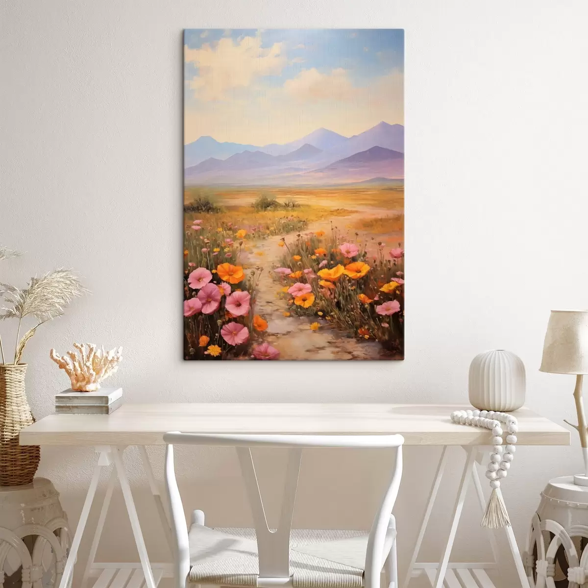 Vászonkép Tájkép, színes virágokkal teli mező, háttérben hegyekkel, lágy, pasztell színekkel Nr s46686